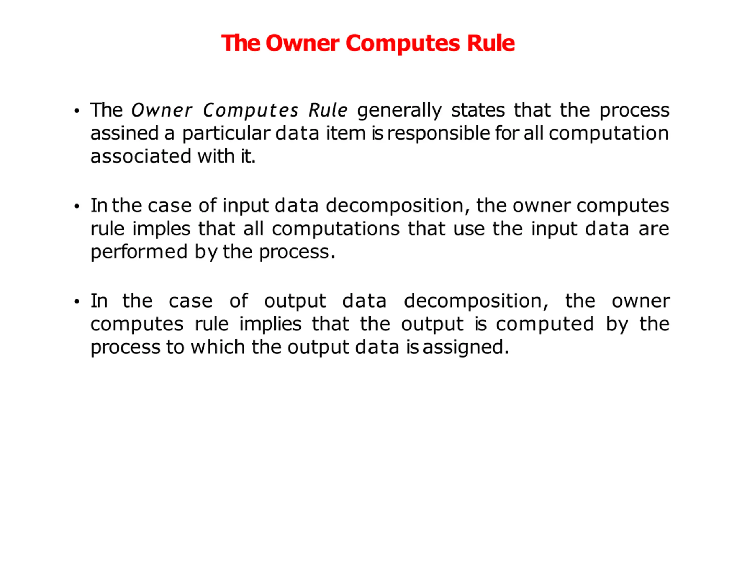 The Owner Computes Rule The Owner Computes Rule generally states that the process assined a particular data item isresponsible forall computation associated with it. Inthe case of input data decomposition, the owner computes rule imples that all computations that use the input data are performed by the process. In the case of output data decomposition, the owner computes rule implies that the output is computed by the process to which the output data isassigned.