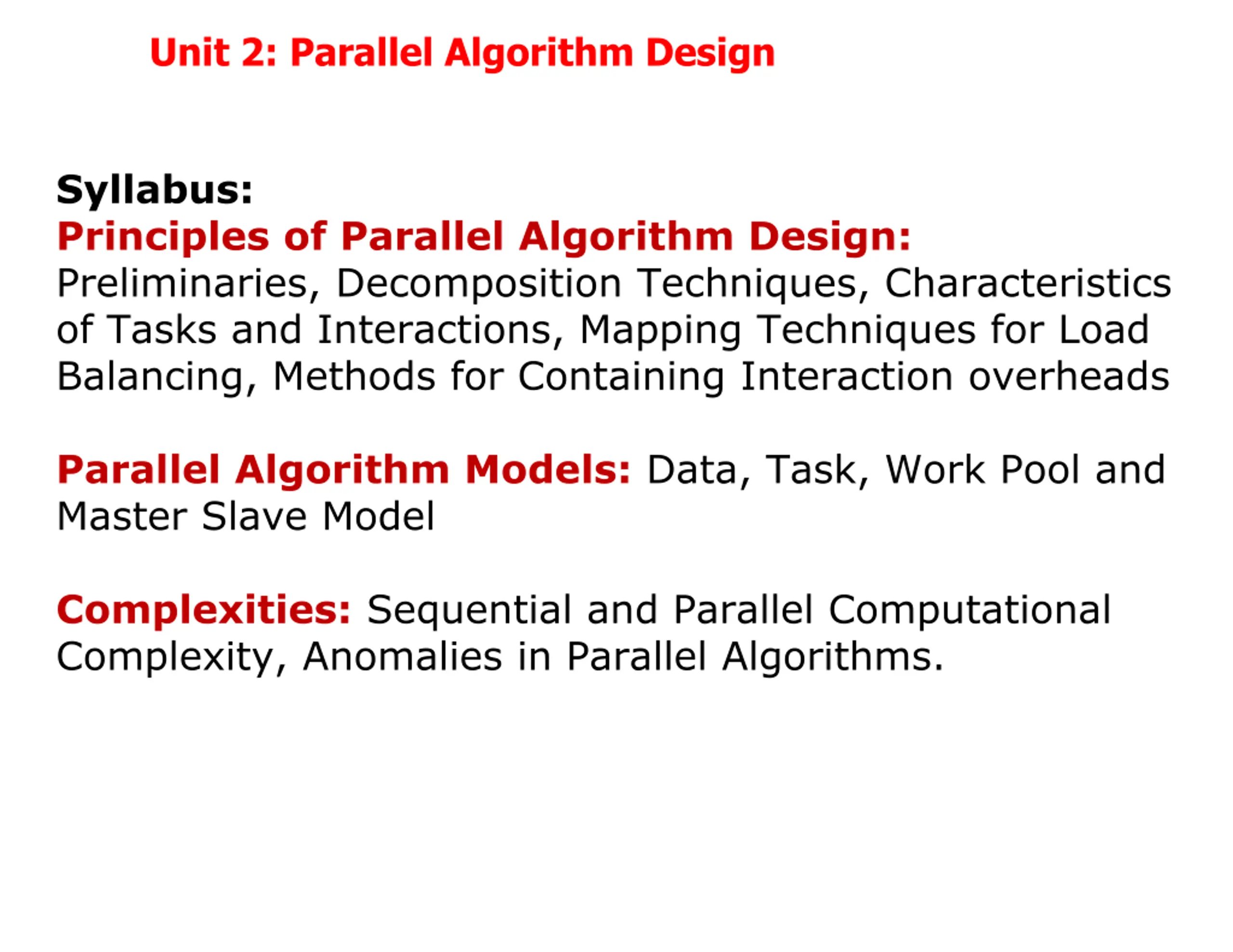 Unit 2: Parallel Algorithm Design Syllabus: Principles of Parallel Algorithm Design: Preliminaries, Decomposition Techniques, Characteristics of Tasks and Interactions, Mapping Techniques for Load Balancing, Methods for Containing Interaction overheads Parallel Algorithm Models: Data, Task, Work Pool and Master Slave Model Complexities: Sequential and Parallel Computational Complexity, Anomalies in Parallel Algorithms.