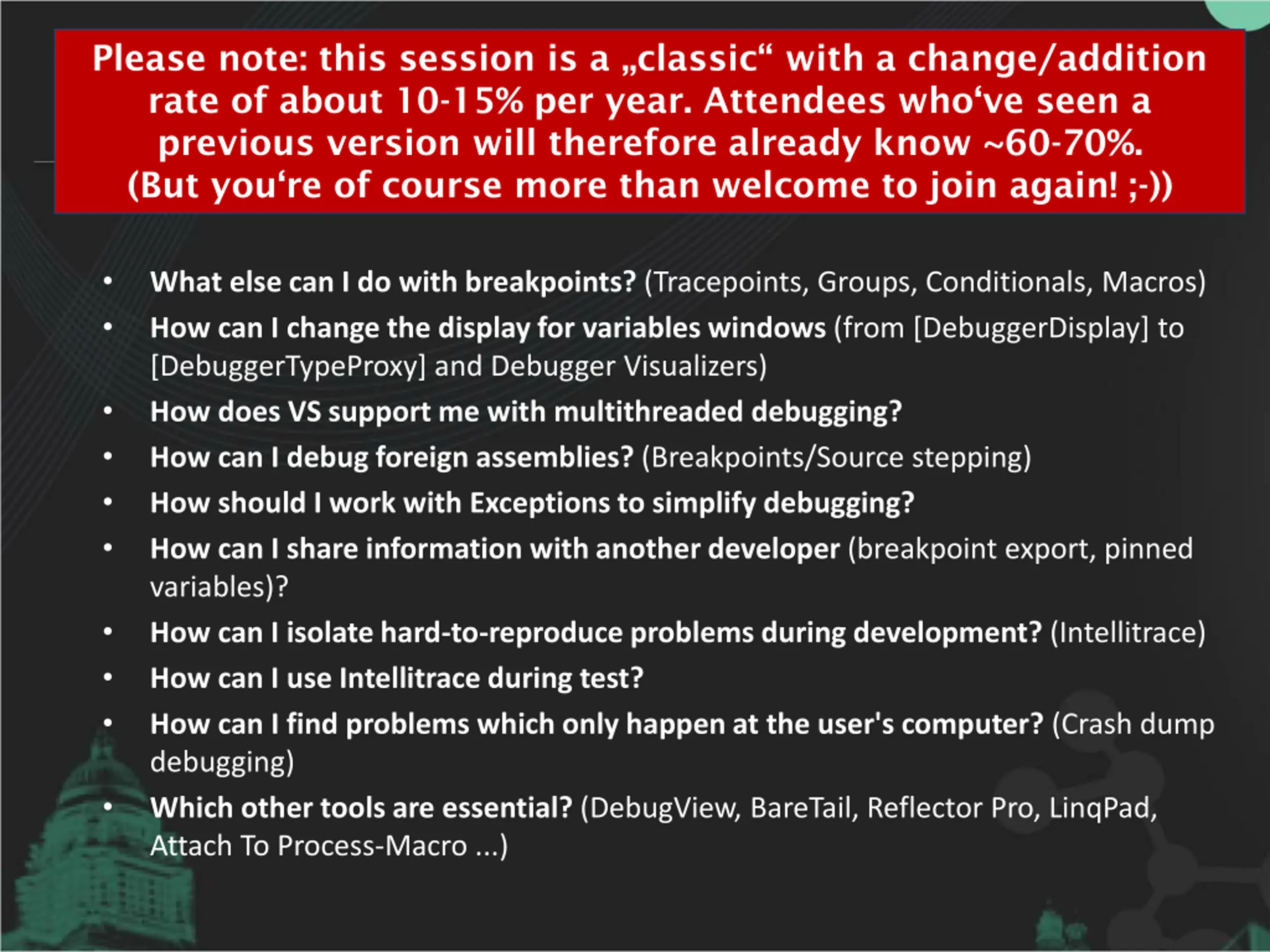 Please note: this session is a classic with a change/addition rate of about 10-15% per year. Attendees who ve seen a previous version will therefore already know ~60-70%. (But you re of course more than welcome to join again! ;-)) What else can I do with breakpoints? (Tracepoints, Groups, Conditionals, Macros) How can I change the display for variables windows (from [DebuggerDisplay] to [DebuggerTypeProxy] and Debugger Visualizers) How does VS support me with multithreaded debugging? How can I debug foreign assemblies? (Breakpoints/Source stepping) How should I work with Exceptions to simplify debugging? How can I share information with another developer (breakpoint export, pinned variables)? How can I isolate hard-to-reproduce problems during development? (Intellitrace) How can I use Intellitrace during test? How can I find problems which only happen at the user's computer? (Crash dump debugging) Which other tools are essential? (DebugView, BareTail, Reflector Pro, LinqPad, Attach To Process-Macro ...)