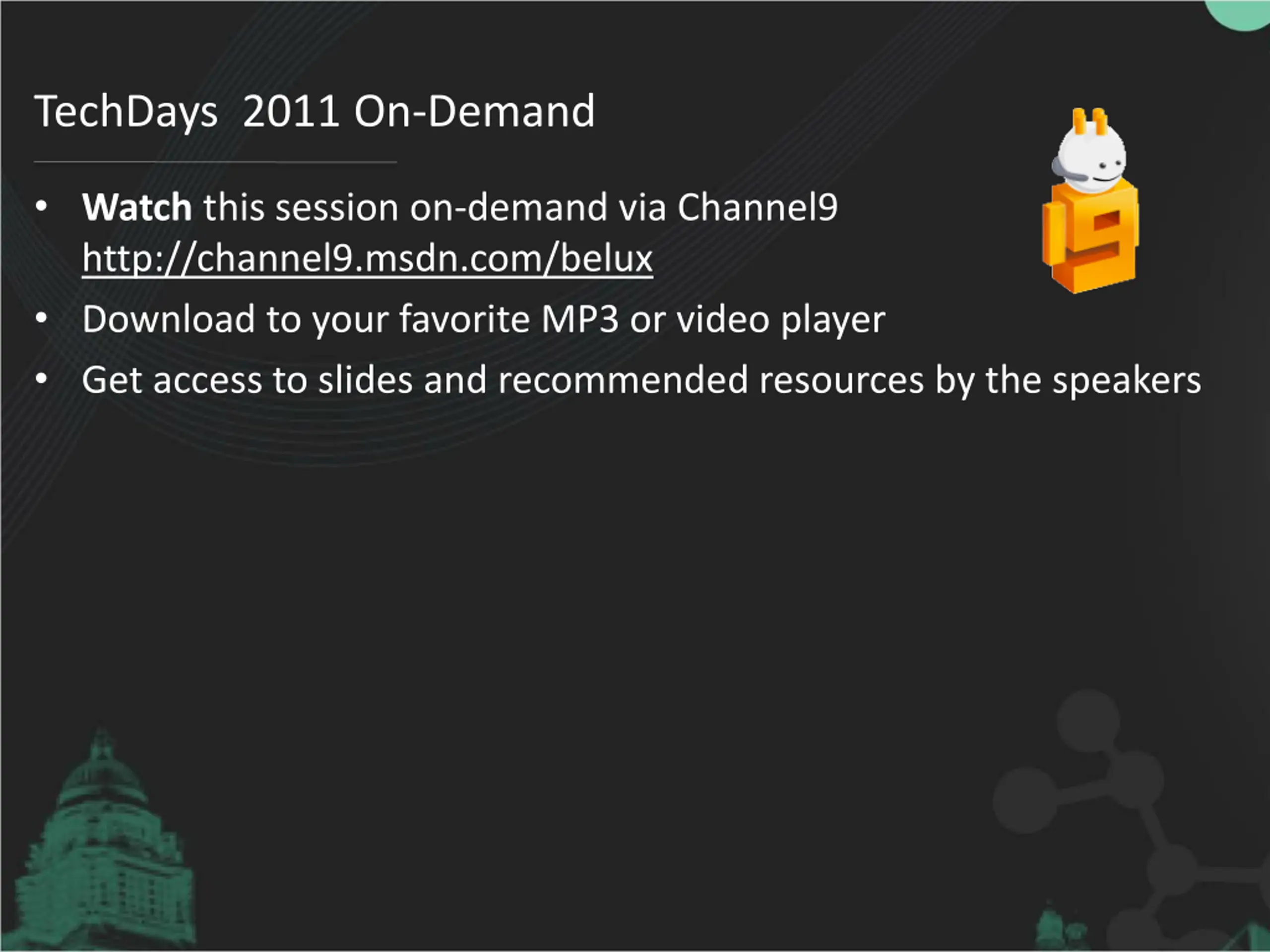 TechDays 2011 On-Demand Watch this session on-demand via Channel9 http://channel9.msdn.com/belux Download to your favorite MP3 or video player Get access to slides and recommended resources by the speakers