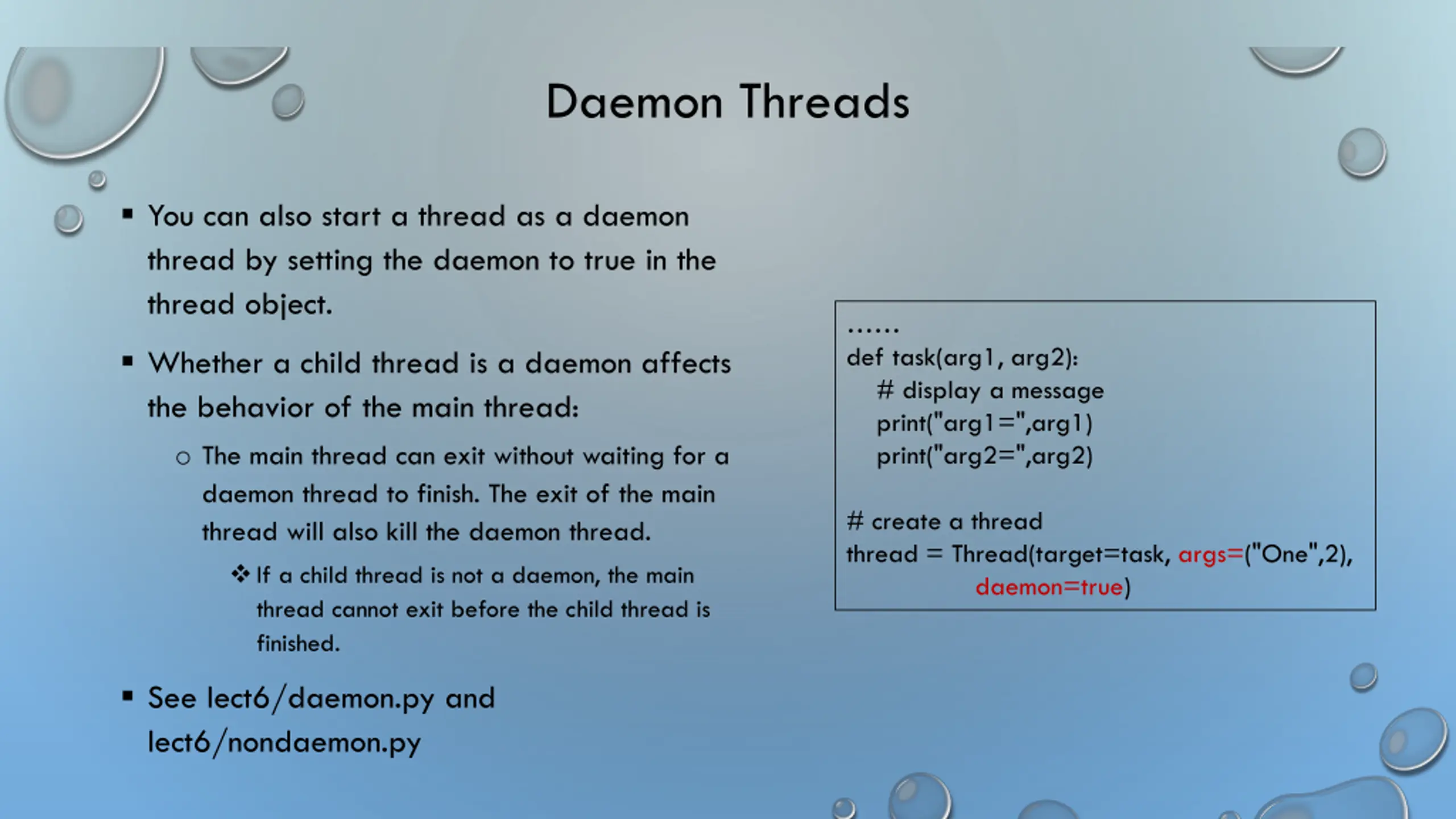 Daemon Threads You can also start a thread as a daemon thread by setting the daemon to true in the thread object. def task(arg1, arg2): # display a message print("arg1=",arg1) print("arg2=",arg2) Whether a child thread is a daemon affects the behavior of the main thread: o The main thread can exit without waiting for a daemon thread to finish. The exit of the main thread will also kill the daemon thread. If a child thread is not a daemon, the main thread cannot exit before the child thread is finished. # create a thread thread = Thread(target=task, args=("One",2), daemon=true) See lect6/daemon.py and lect6/nondaemon.py