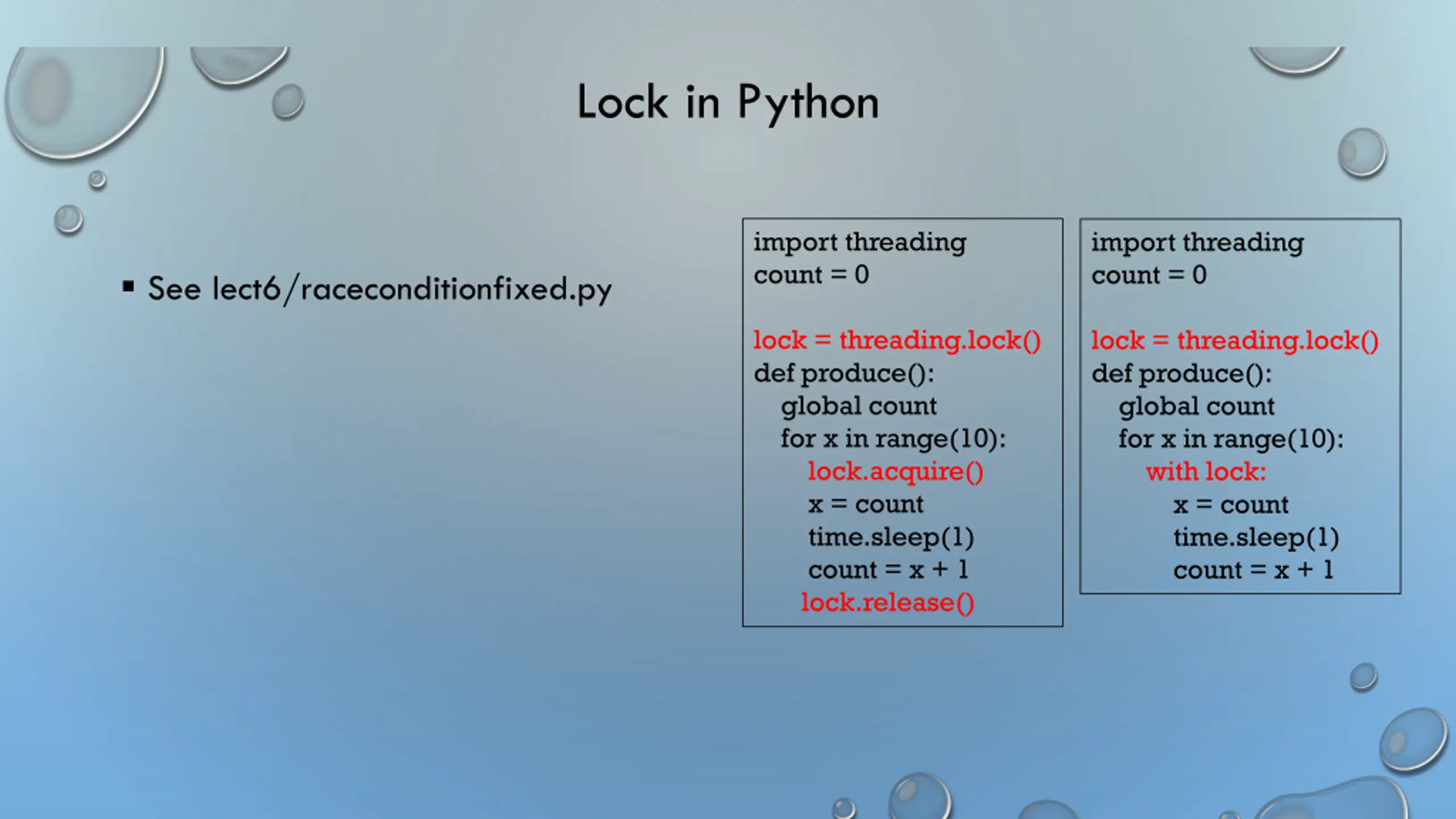 Lock in Python import threading count = 0 import threading count = 0 See lect6/raceconditionfixed.py lock = threading.lock() def produce(): global count for x in range(10): lock.acquire() x = count time.sleep(1) count = x + 1 lock.release() lock = threading.lock() def produce(): global count for x in range(10): with lock: x = count time.sleep(1) count = x + 1