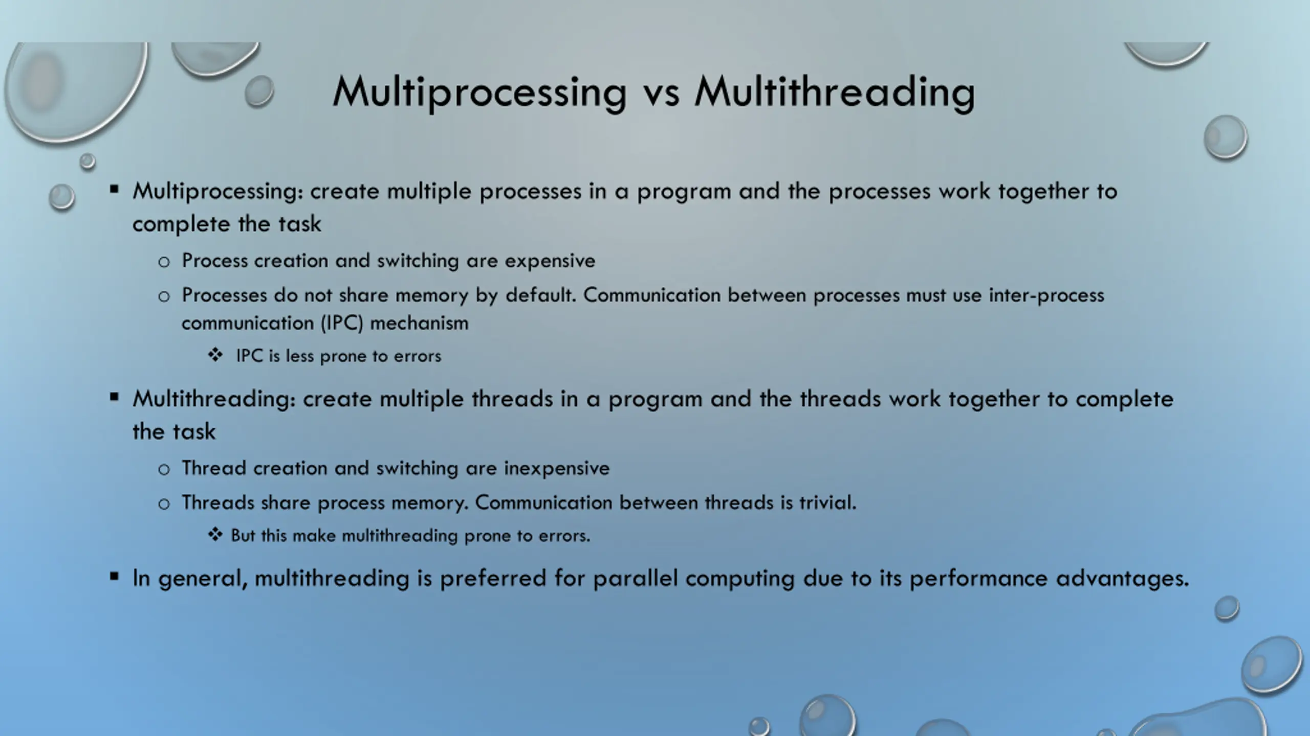 Multiprocessing vs Multithreading Multiprocessing: create multiple processes in a program and the processes work together to complete the task o Process creation and switching are expensive o Processes do not share memory by default. Communication between processes must use inter-process communication (IPC) mechanism IPC is less prone to errors Multithreading: create multiple threads in a program and the threads work together to complete the task o Thread creation and switching are inexpensive o Threads share process memory. Communication between threads is trivial. But this make multithreading prone to errors. In general, multithreading is preferred for parallel computing due to its performance advantages.