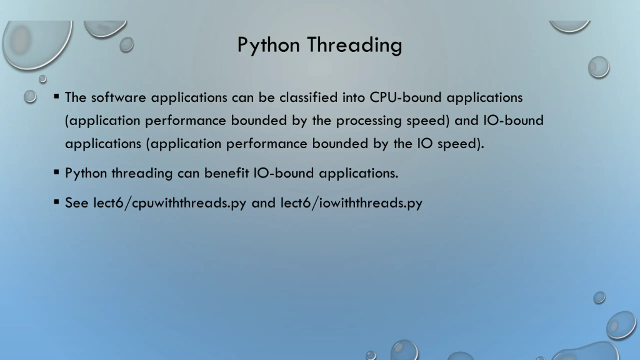 Python Threading The software applications can be classified into CPU-bound applications (application performance bounded by the processing speed) and IO-bound applications (application performance bounded by the IO speed). Python threading can benefit IO-bound applications. See lect6/cpuwiththreads.py and lect6/iowiththreads.py