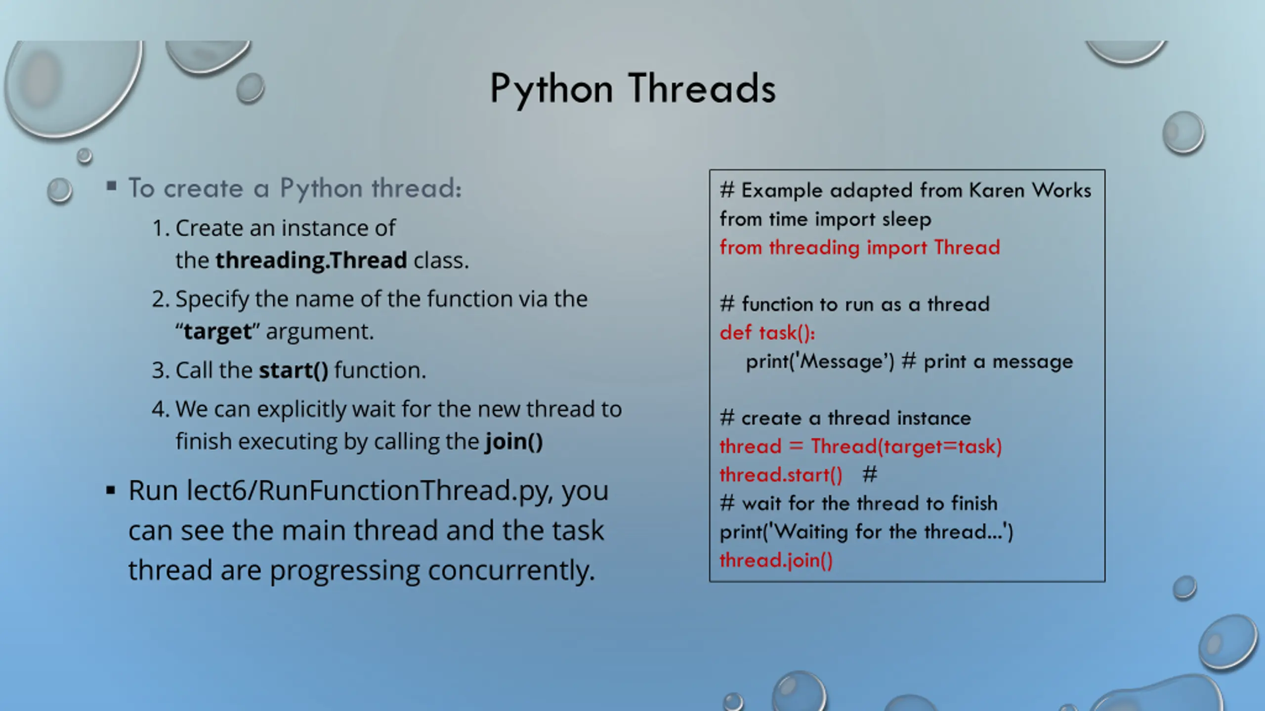 Python Threads To create a Python thread: 1. Create an instance of the threading.Thread class. 2. Specify the name of the function via the target argument. 3. Call the start() function. 4. We can explicitly wait for the new thread to finish executing by calling the join() # Example adapted from Karen Works from time import sleep from threading import Thread # function to run as a thread def task(): print('Message ) # print a message # create a thread instance thread = Thread(target=task) thread.start() # # wait for the thread to finish print('Waiting for the thread...') thread.join() Run lect6/RunFunctionThread.py, you can see the main thread and the task thread are progressing concurrently.