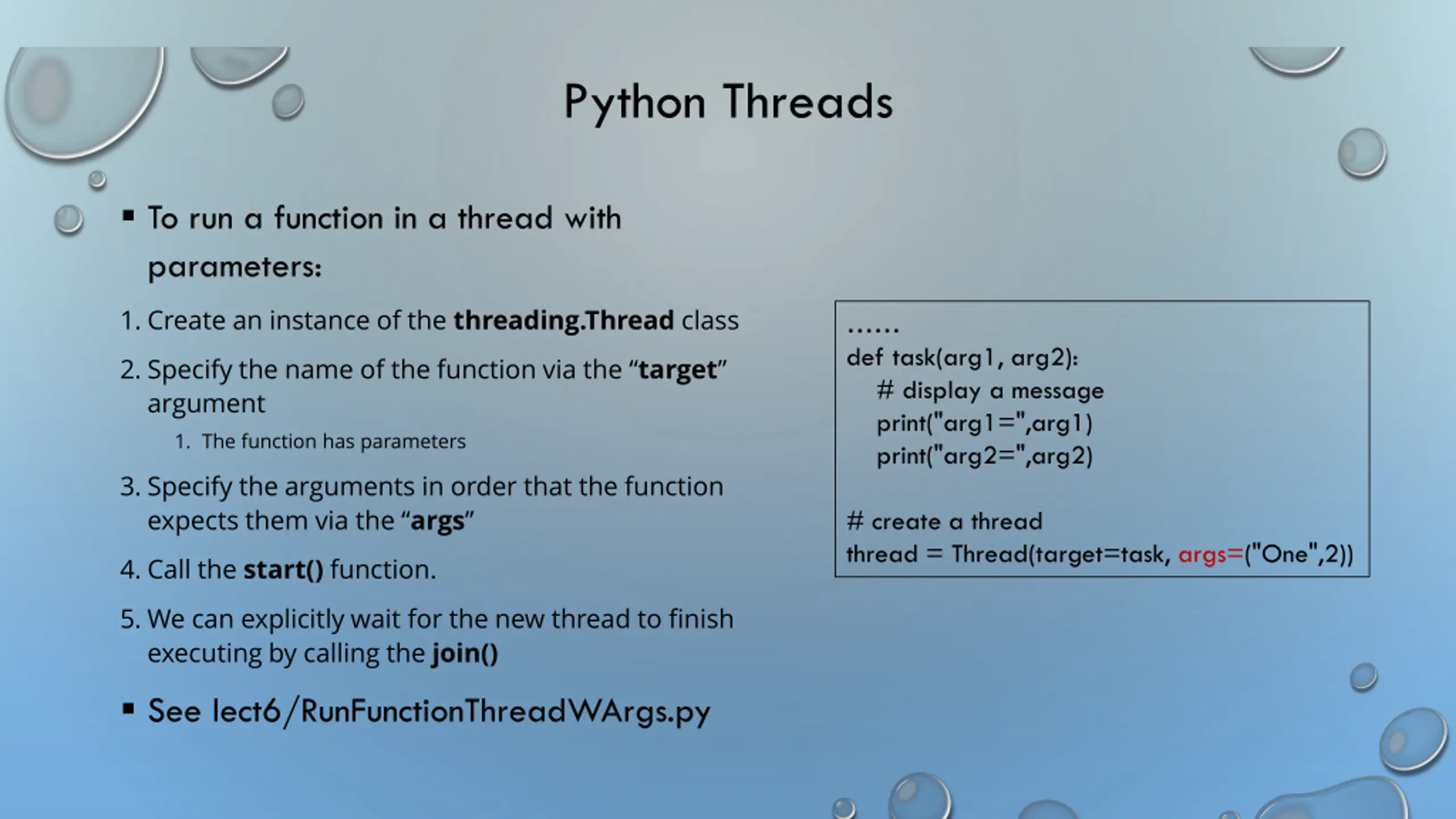 Python Threads To run a function in a thread with parameters: 1. Create an instance of the threading.Thread class def task(arg1, arg2): # display a message print("arg1=",arg1) print("arg2=",arg2) 2. Specify the name of the function via the target argument 1. The function has parameters 3. Specify the arguments in order that the function expects them via the args # create a thread thread = Thread(target=task, args=("One",2)) 4. Call the start() function. 5. We can explicitly wait for the new thread to finish executing by calling the join() See lect6/RunFunctionThreadWArgs.py