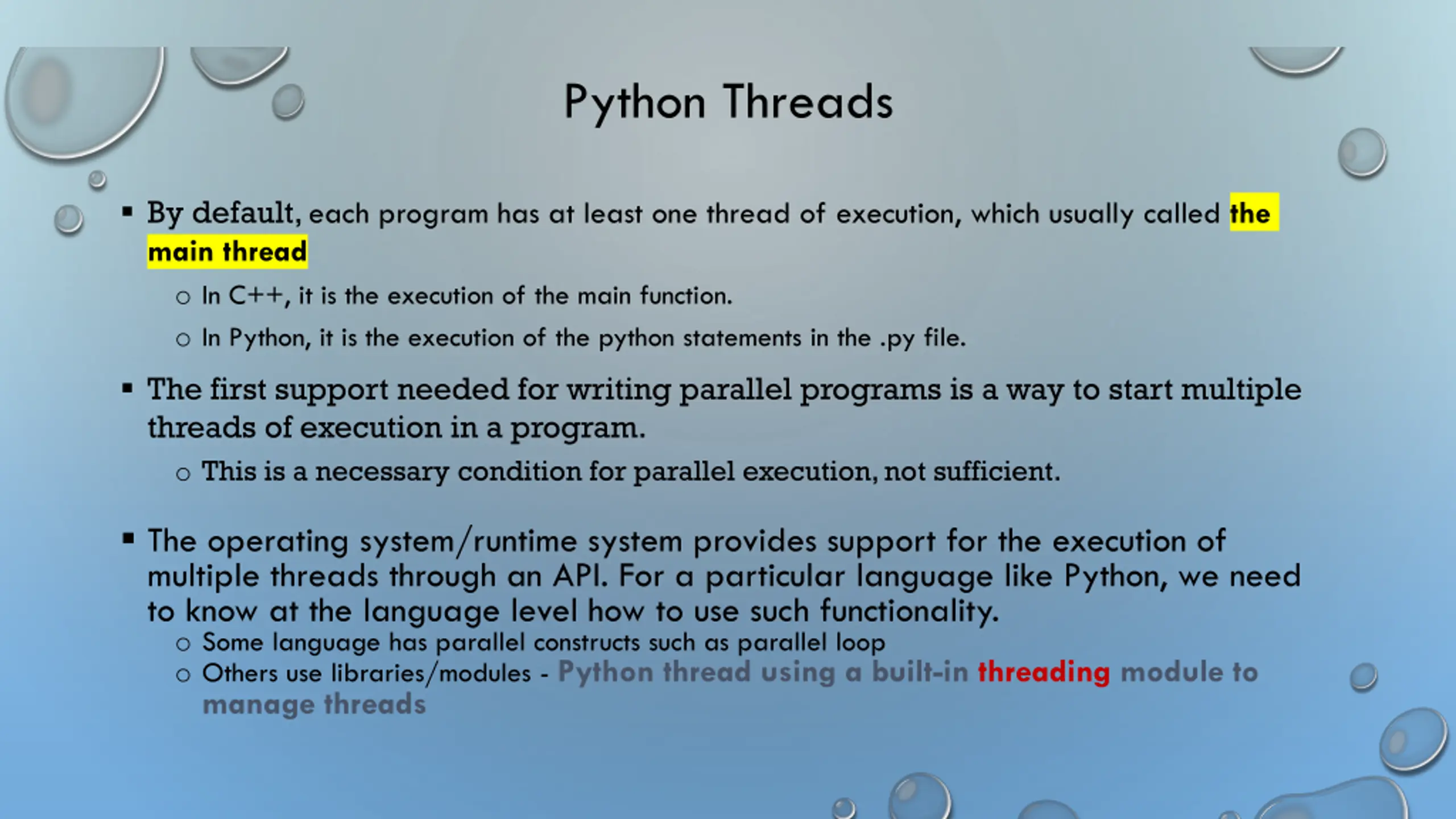 Python Threads By default, each program has at least one thread of execution, which usually called the main thread o In C++, it is the execution of the main function. o In Python, it is the execution of the python statements in the .py file. The first support needed for writing parallel programs is a way to start multiple threads of execution in a program. o This is a necessary condition for parallel execution, not sufficient. The operating system/runtime system provides support for the execution of multiple threads through an API. For a particular language like Python, we need to know at the language level how to use such functionality. o Some language has parallel constructs such as parallel loop o Others use libraries/modules - Python thread using a built-in threading module to manage threads