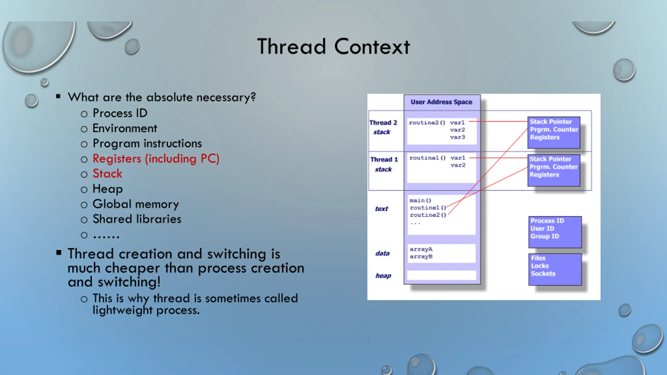 Thread Context What are the absolute necessary? o Process ID o Environment o Program instructions o Registers (including PC) o Stack o Heap o Global memory o Shared libraries o Thread creation and switching is much cheaper than process creation and switching! o This is why thread is sometimes called lightweight process.