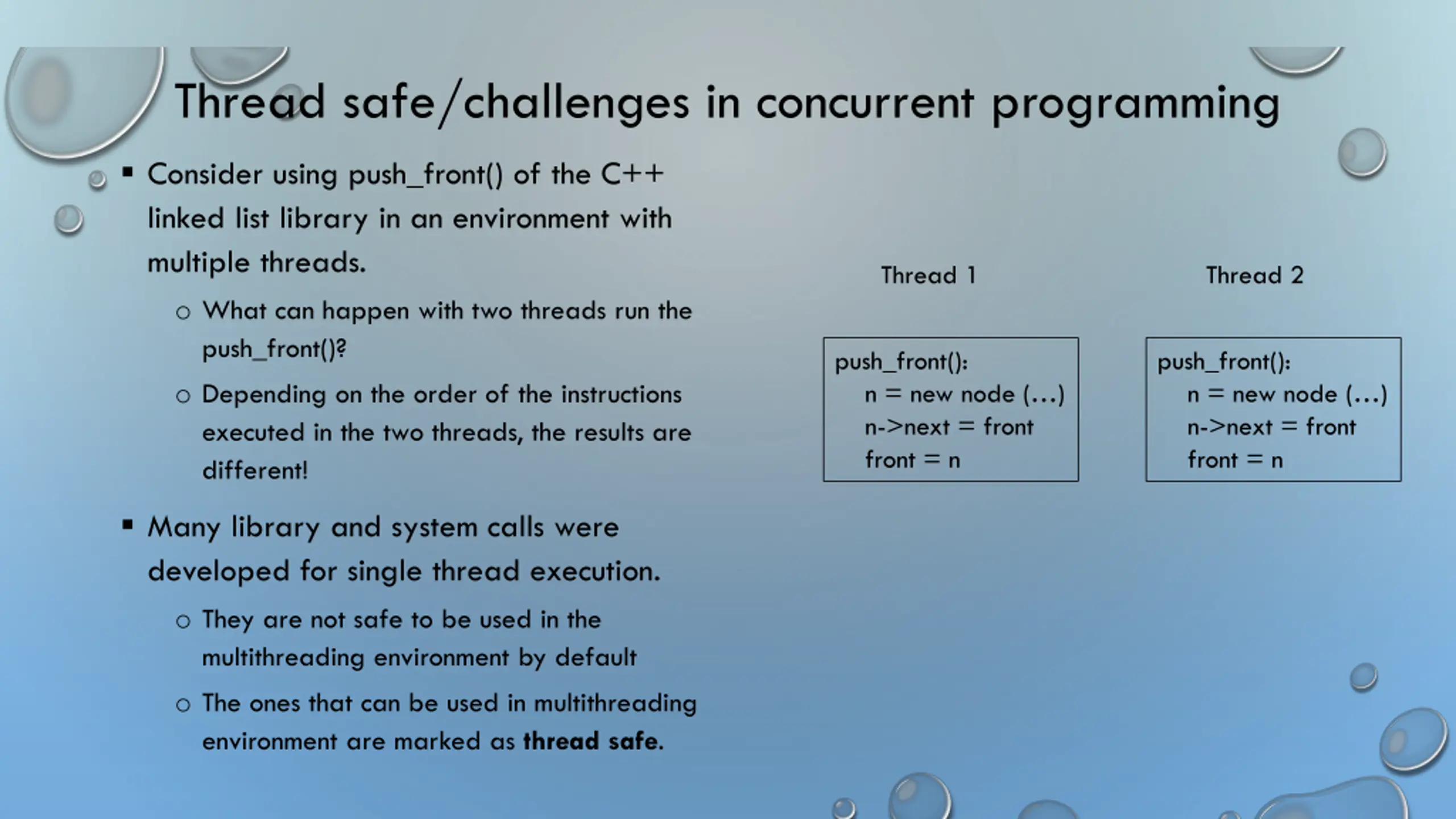 Thread safe/challenges in concurrent programming Consider using push_front() of the C++ linked list library in an environment with multiple threads. Thread 1 Thread 2 o What can happen with two threads run the push_front()? push_front(): n = new node ( ) n->next = front front = n push_front(): n = new node ( ) n->next = front front = n o Depending on the order of the instructions executed in the two threads, the results are different! Many library and system calls were developed for single thread execution. o They are not safe to be used in the multithreading environment by default o The ones that can be used in multithreading environment are marked as thread safe.