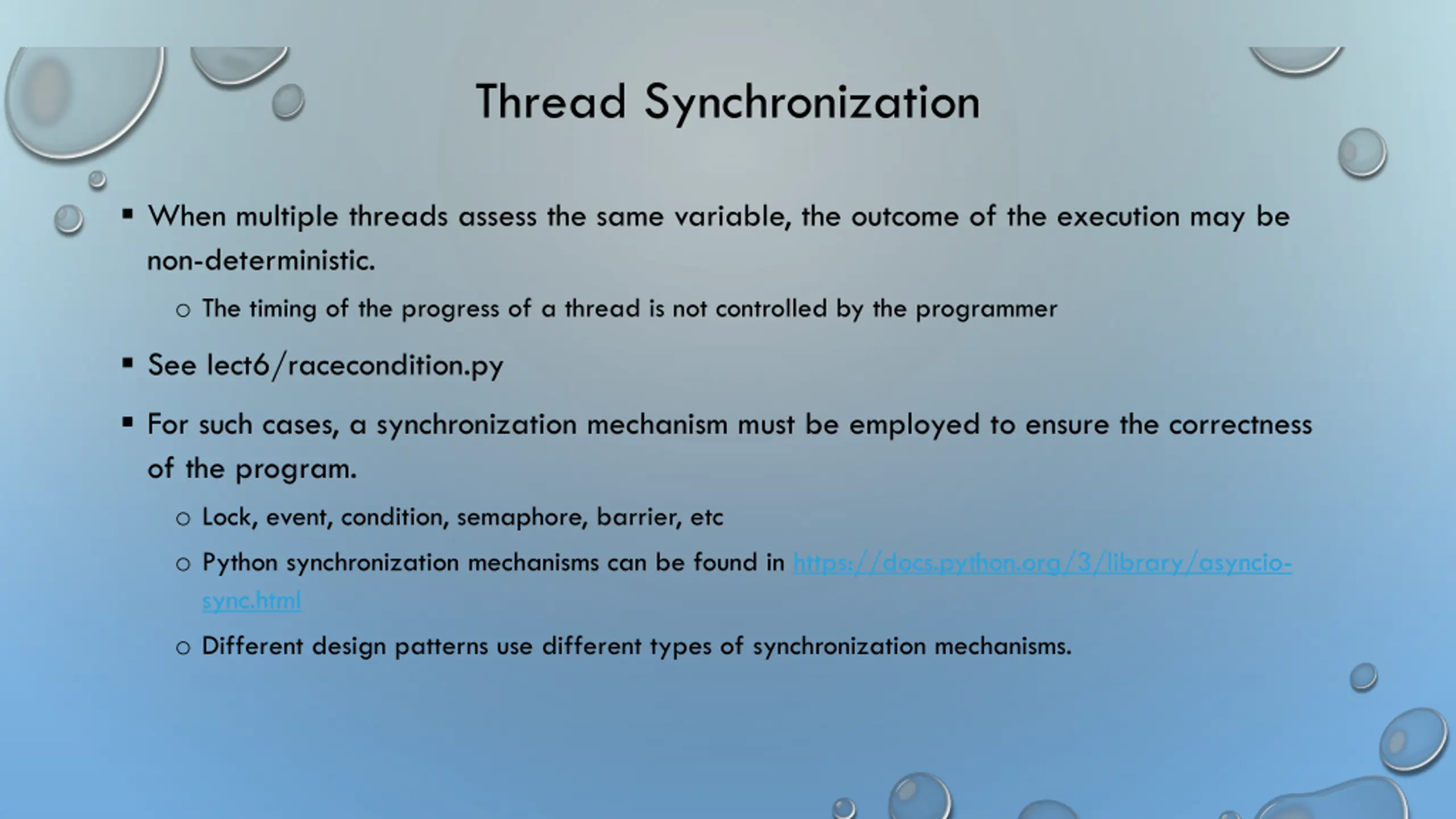Thread Synchronization When multiple threads assess the same variable, the outcome of the execution may be non-deterministic. o The timing of the progress of a thread is not controlled by the programmer See lect6/racecondition.py For such cases, a synchronization mechanism must be employed to ensure the correctness of the program. o Lock, event, condition, semaphore, barrier, etc o Python synchronization mechanisms can be found in https://docs.python.org/3/library/asyncio- sync.html o Different design patterns use different types of synchronization mechanisms.