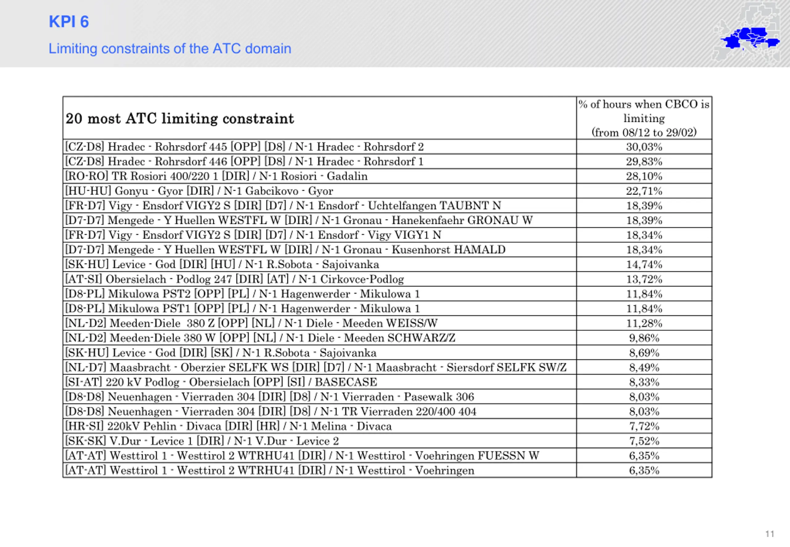 KPI 6 Limiting constraints of the ATC domain % of hours when CBCO is limiting (from 08/12 to 29/02) 30,03% 29,83% 28,10% 22,71% 18,39% 18,39% 18,34% 18,34% 14,74% 13,72% 11,84% 11,84% 11,28% 9,86% 8,69% 8,49% 8,33% 8,03% 8,03% 7,72% 7,52% 6,35% 6,35% 20 most ATC limiting constraint 20 most ATC limiting constraint [CZ-D8] Hradec - Rohrsdorf 445 [OPP] [D8] / N-1 Hradec - Rohrsdorf 2 [CZ-D8] Hradec - Rohrsdorf 446 [OPP] [D8] / N-1 Hradec - Rohrsdorf 1 [RO-RO] TR Rosiori 400/220 1 [DIR] / N-1 Rosiori - Gadalin [HU-HU] Gonyu - Gyor [DIR] / N-1 Gabcikovo - Gyor [FR-D7] Vigy - Ensdorf VIGY2 S [DIR] [D7] / N-1 Ensdorf - Uchtelfangen TAUBNT N [D7-D7] Mengede - Y Huellen WESTFL W [DIR] / N-1 Gronau - Hanekenfaehr GRONAU W [FR-D7] Vigy - Ensdorf VIGY2 S [DIR] [D7] / N-1 Ensdorf - Vigy VIGY1 N [D7-D7] Mengede - Y Huellen WESTFL W [DIR] / N-1 Gronau - Kusenhorst HAMALD [SK-HU] Levice - God [DIR] [HU] / N-1 R.Sobota - Sajoivanka [AT-SI] Obersielach - Podlog 247 [DIR] [AT] / N-1 Cirkovce-Podlog [D8-PL] Mikulowa PST2 [OPP] [PL] / N-1 Hagenwerder - Mikulowa 1 [D8-PL] Mikulowa PST1 [OPP] [PL] / N-1 Hagenwerder - Mikulowa 1 [NL-D2] Meeden-Diele 380 Z [OPP] [NL] / N-1 Diele - Meeden WEISS/W [NL-D2] Meeden-Diele 380 W [OPP] [NL] / N-1 Diele - Meeden SCHWARZ/Z [SK-HU] Levice - God [DIR] [SK] / N-1 R.Sobota - Sajoivanka [NL-D7] Maasbracht - Oberzier SELFK WS [DIR] [D7] / N-1 Maasbracht - Siersdorf SELFK SW/Z [SI-AT] 220 kV Podlog - Obersielach [OPP] [SI] / BASECASE [D8-D8] Neuenhagen - Vierraden 304 [DIR] [D8] / N-1 Vierraden - Pasewalk 306 [D8-D8] Neuenhagen - Vierraden 304 [DIR] [D8] / N-1 TR Vierraden 220/400 404 [HR-SI] 220kV Pehlin - Divaca [DIR] [HR] / N-1 Melina - Divaca [SK-SK] V.Dur - Levice 1 [DIR] / N-1 V.Dur - Levice 2 [AT-AT] Westtirol 1 - Westtirol 2 WTRHU41 [DIR] / N-1 Westtirol - Voehringen FUESSN W [AT-AT] Westtirol 1 - Westtirol 2 WTRHU41 [DIR] / N-1 Westtirol - Voehringen 11