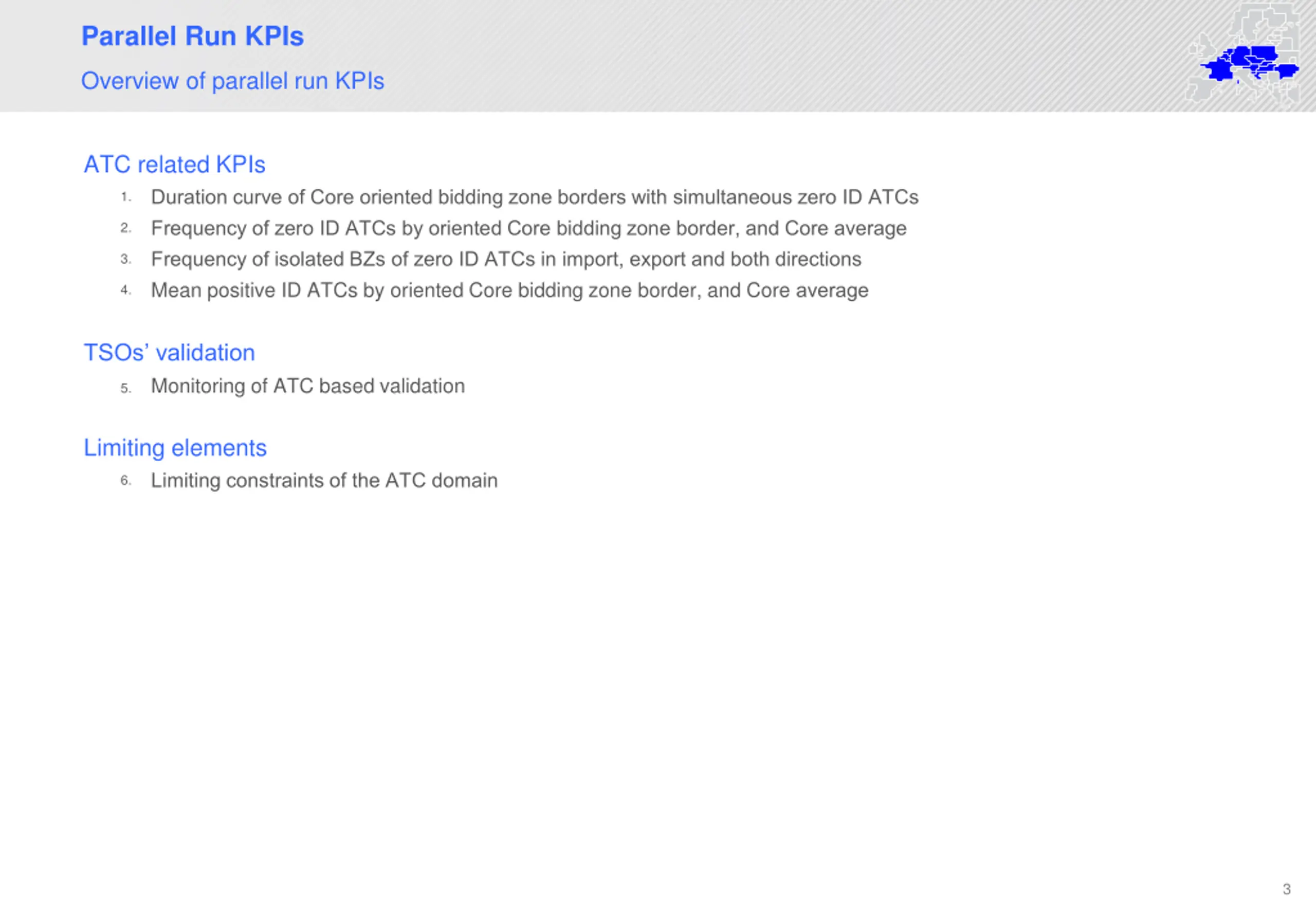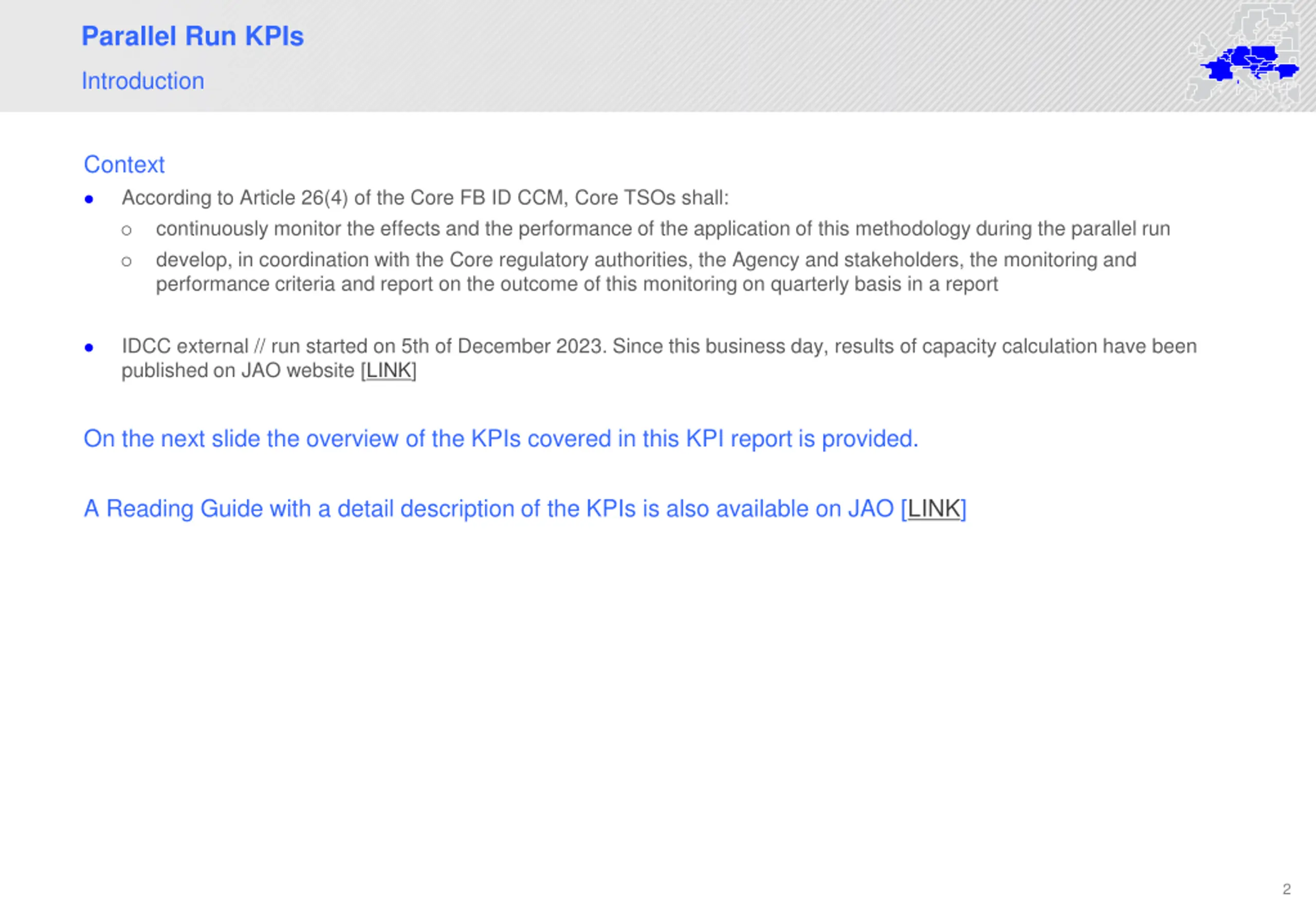 Parallel Run KPIs Introduction Context According to Article 26(4) of the Core FB ID CCM, Core TSOs shall: continuously monitor the effects and the performance of the application of this methodology during the parallel run develop, in coordination with the Core regulatory authorities, the Agency and stakeholders, the monitoring and performance criteria and report on the outcome of this monitoring on quarterly basis in a report IDCC external // run started on 5th of December 2023. Since this business day, results of capacity calculation have been published on JAO website [LINK] On the next slide the overview of the KPIs covered in this KPI report is provided. A Reading Guide with a detail description of the KPIs is also available on JAO [LINK] 2