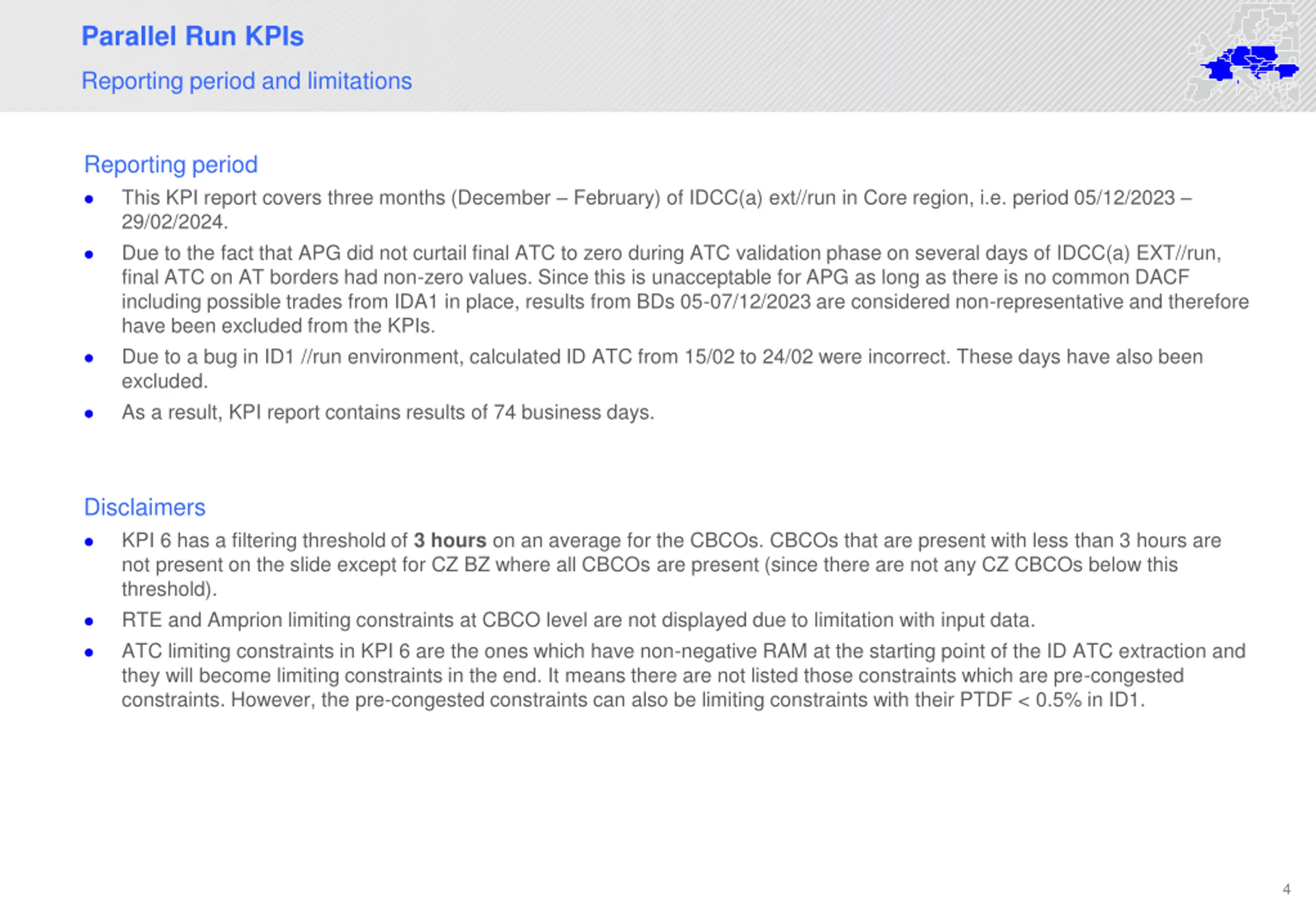 Parallel Run KPIs Reporting period and limitations Reporting period This KPI report covers three months (December February) of IDCC(a) ext//run in Core region, i.e. period 05/12/2023 29/02/2024. Due to the fact that APG did not curtail final ATC to zero during ATC validation phase on several days of IDCC(a) EXT//run, final ATC on AT borders had non-zero values. Since this is unacceptable for APG as long as there is no common DACF including possible trades from IDA1 in place, results from BDs 05-07/12/2023 are considered non-representative and therefore have been excluded from the KPIs. Due to a bug in ID1 //run environment, calculated ID ATC from 15/02 to 24/02 were incorrect. These days have also been excluded. As a result, KPI report contains results of 74 business days. Disclaimers KPI 6 has a filtering threshold of 3 hours on an average for the CBCOs. CBCOs that are present with less than 3 hours are not present on the slide except for CZ BZ where all CBCOs are present (since there are not any CZ CBCOs below this threshold). RTE and Amprion limiting constraints at CBCO level are not displayed due to limitation with input data. ATC limiting constraints in KPI 6 are the ones which have non-negative RAM at the starting point of the ID ATC extraction and they will become limiting constraints in the end. It means there are not listed those constraints which are pre-congested constraints. However, the pre-congested constraints can also be limiting constraints with their PTDF < 0.5% in ID1. 4