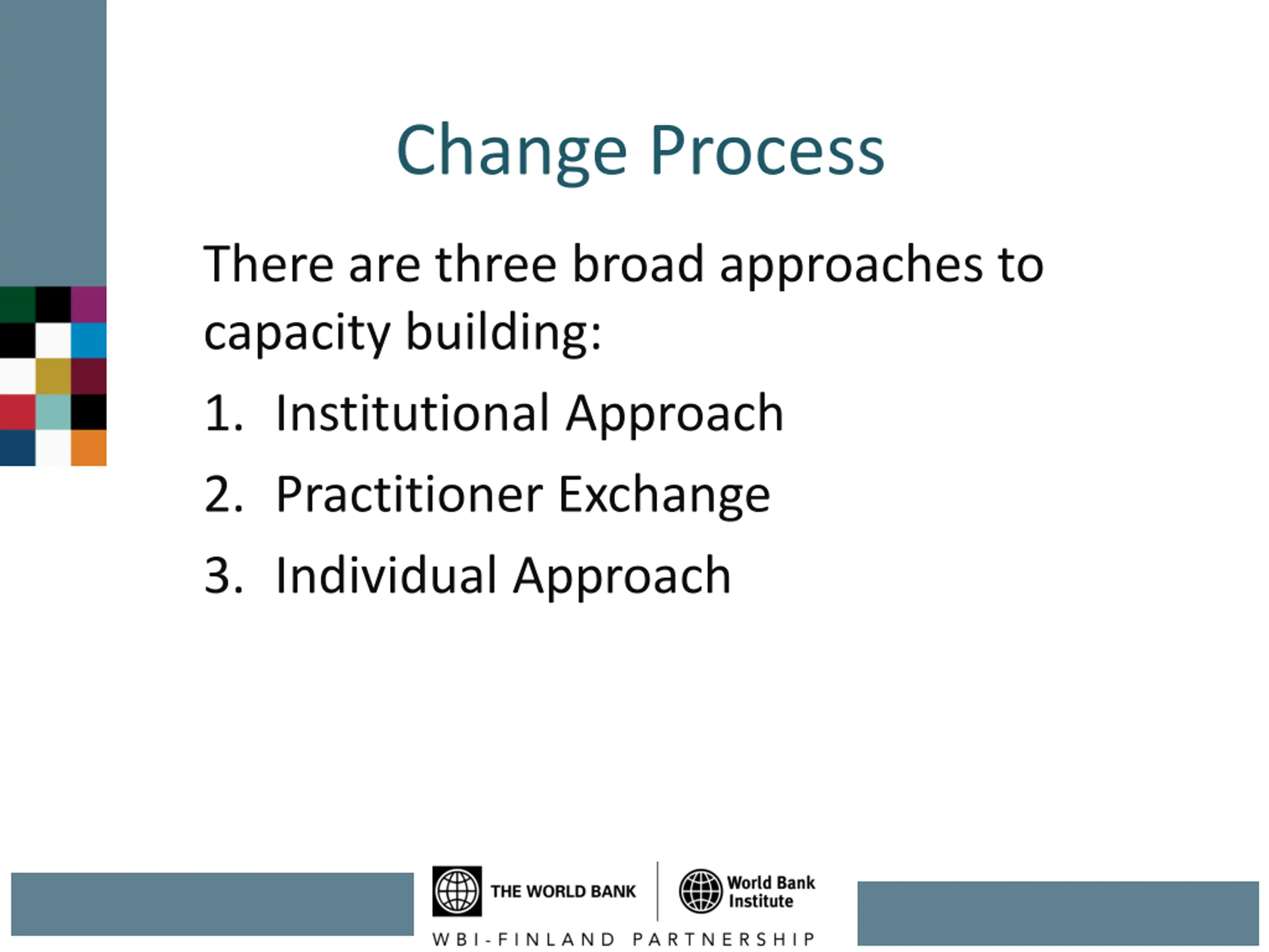 Change Process There are three broad approaches to capacity building: 1. Institutional Approach 2. Practitioner Exchange 3. Individual Approach