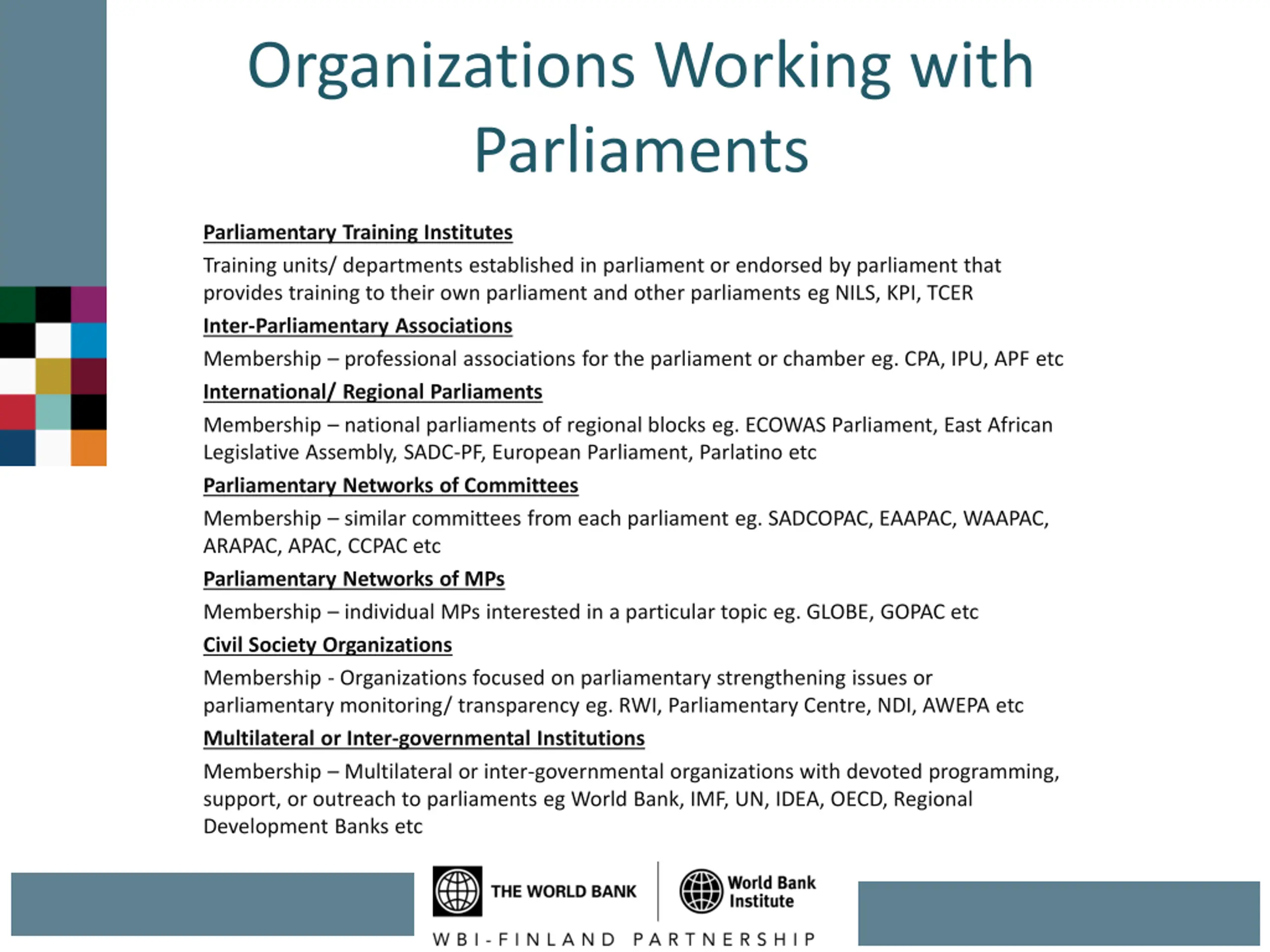 Organizations Working with Parliaments Parliamentary Training Institutes Training units/ departments established in parliament or endorsed by parliament that provides training to their own parliament and other parliaments eg NILS, KPI, TCER Inter-Parliamentary Associations Membership professional associations for the parliament or chamber eg. CPA, IPU, APF etc International/ Regional Parliaments Membership national parliaments of regional blocks eg. ECOWAS Parliament, East African Legislative Assembly, SADC-PF, European Parliament, Parlatino etc Parliamentary Networks of Committees Membership similar committees from each parliament eg. SADCOPAC, EAAPAC, WAAPAC, ARAPAC, APAC, CCPAC etc Parliamentary Networks of MPs Membership individual MPs interested in a particular topic eg. GLOBE, GOPAC etc Civil Society Organizations Membership - Organizations focused on parliamentary strengthening issues or parliamentary monitoring/ transparency eg. RWI, Parliamentary Centre, NDI, AWEPA etc Multilateral or Inter-governmental Institutions Membership Multilateral or inter-governmental organizations with devoted programming, support, or outreach to parliaments eg World Bank, IMF, UN, IDEA, OECD, Regional Development Banks etc