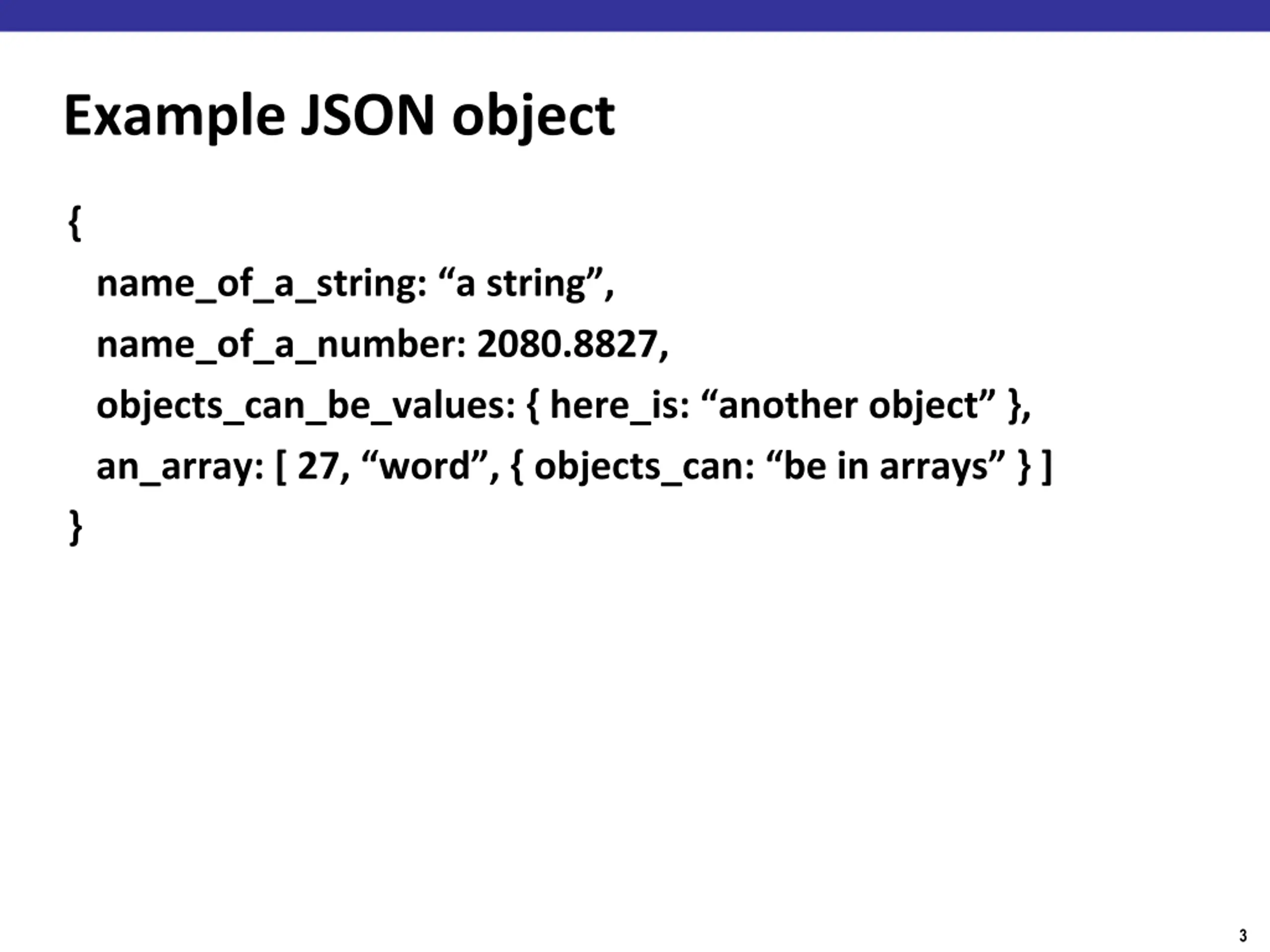 Example JSON object { name_of_a_string: a string , name_of_a_number: 2080.8827, objects_can_be_values: { here_is: another object }, an_array: [ 27, word , { objects_can: be in arrays } ] } 3