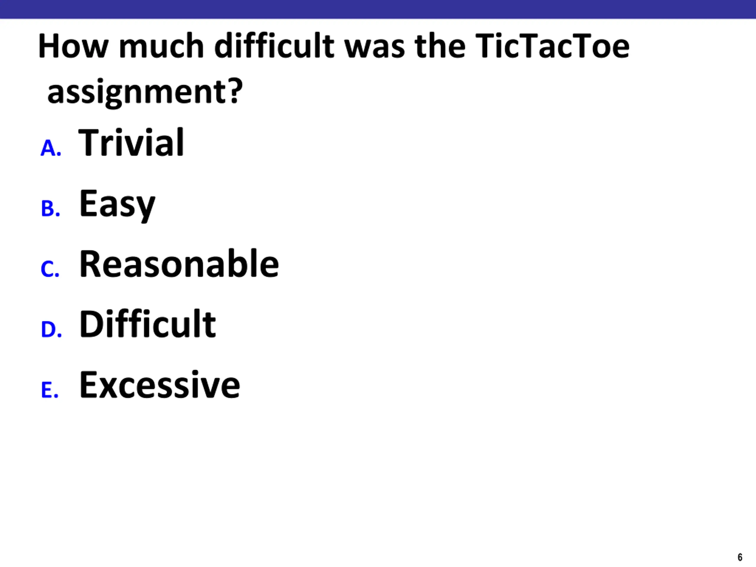 How much difficult was the TicTacToe assignment? A. Trivial B. Easy C. Reasonable D. Difficult E. Excessive 6