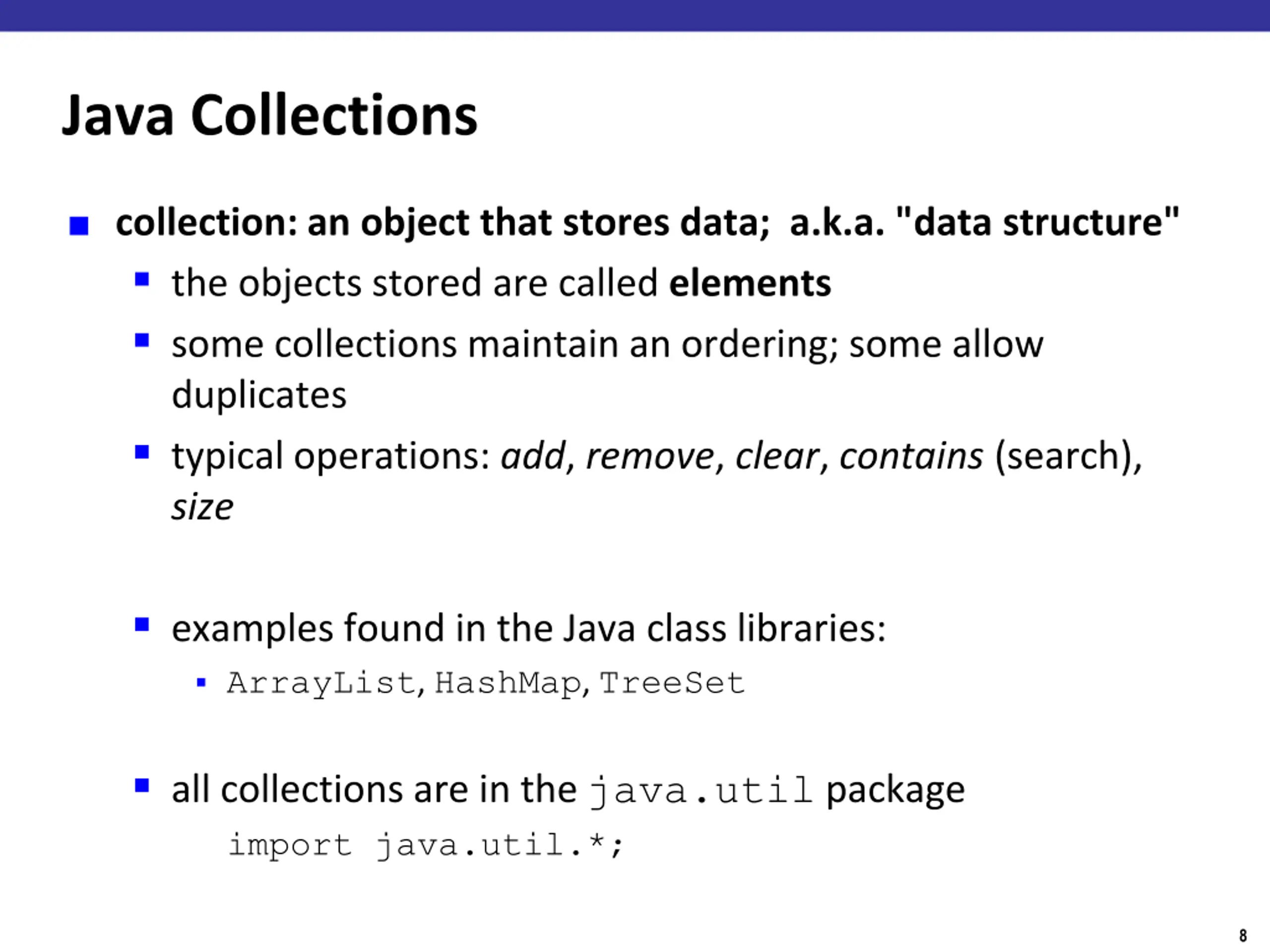 Java Collections collection: an object that stores data; a.k.a. "data structure" the objects stored are called elements some collections maintain an ordering; some allow duplicates typical operations: add, remove, clear, contains (search), size examples found in the Java class libraries: ArrayList, HashMap, TreeSet all collections are in the java.util package import java.util.*; 8