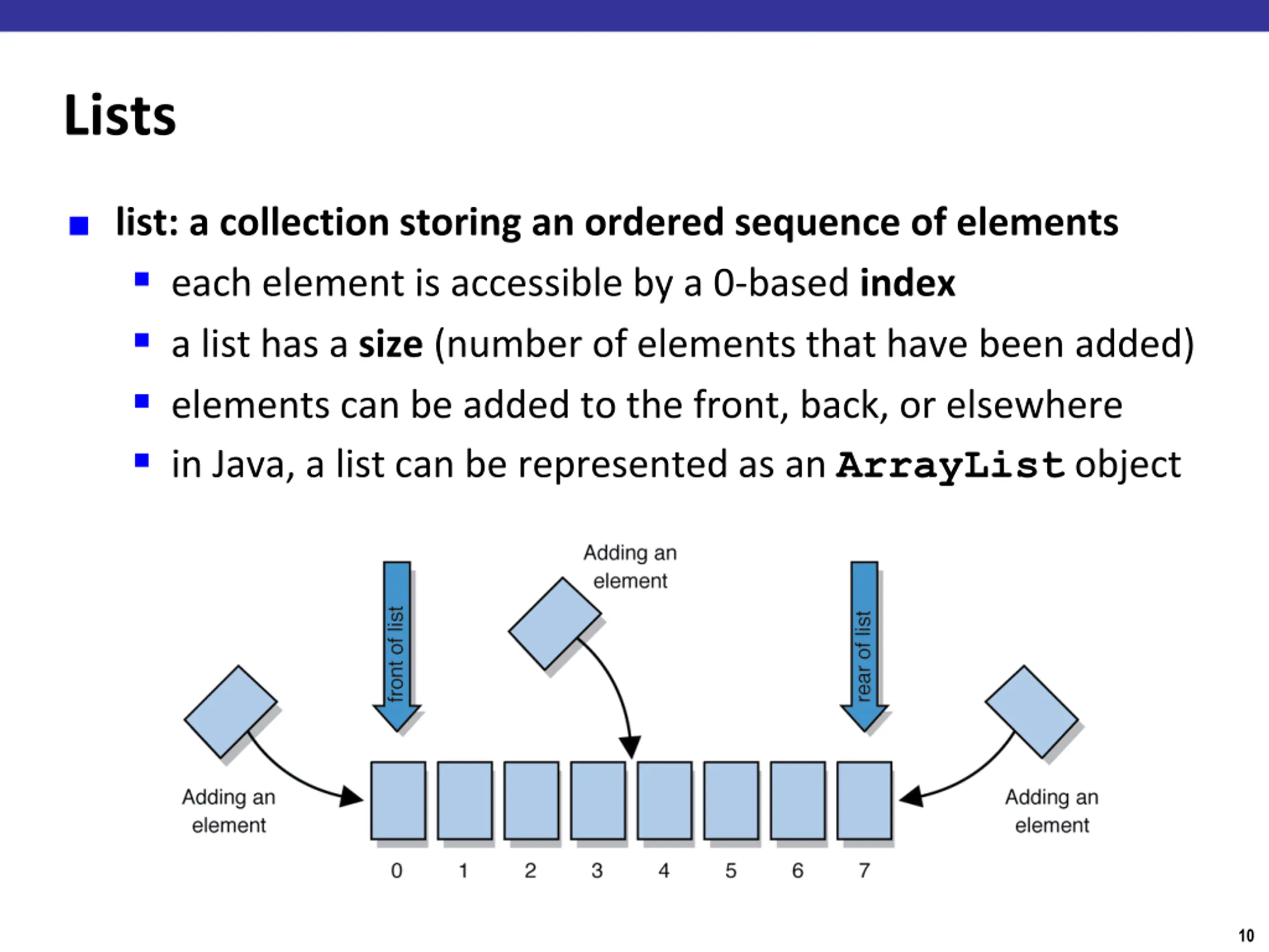 Lists list: a collection storing an ordered sequence of elements each element is accessible by a 0-based index a list has a size (number of elements that have been added) elements can be added to the front, back, or elsewhere in Java, a list can be represented as an ArrayList object 10