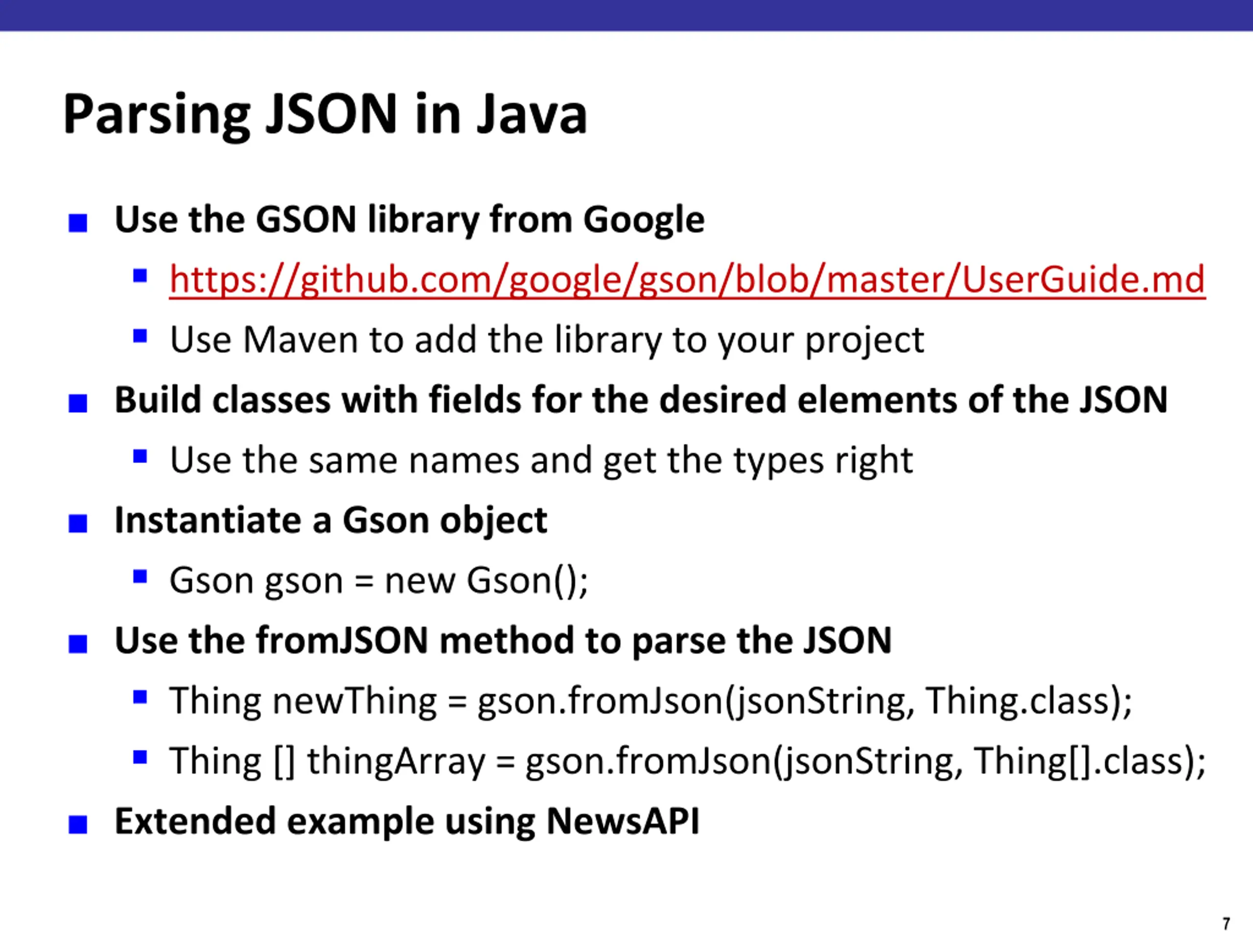 Parsing JSON in Java Use the GSON library from Google https://github.com/google/gson/blob/master/UserGuide.md Use Maven to add the library to your project Build classes with fields for the desired elements of the JSON Use the same names and get the types right Instantiate a Gson object Gson gson = new Gson(); Use the fromJSON method to parse the JSON Thing newThing = gson.fromJson(jsonString, Thing.class); Thing [] thingArray = gson.fromJson(jsonString, Thing[].class); Extended example using NewsAPI 7