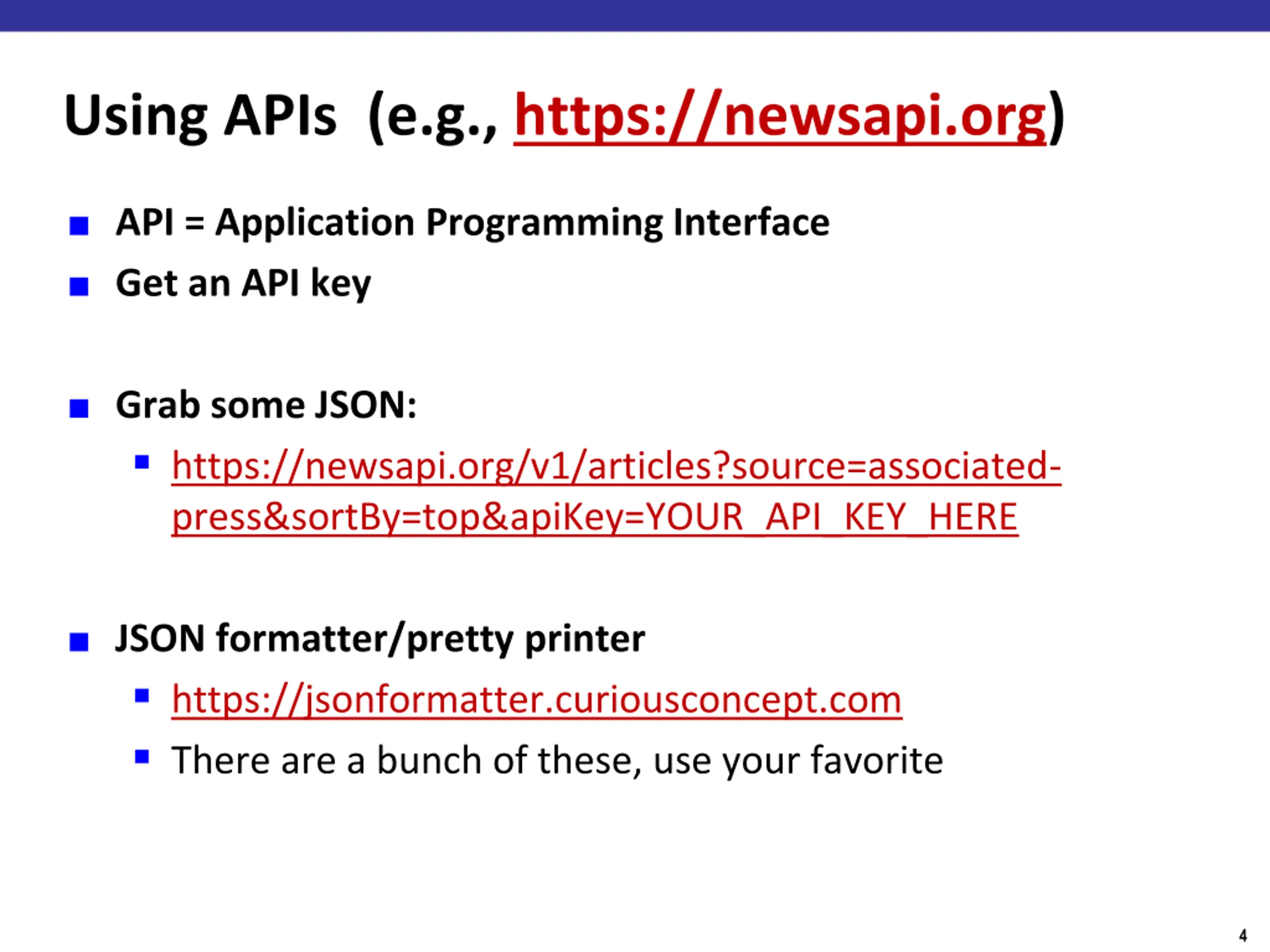 Using APIs (e.g., https://newsapi.org) API = Application Programming Interface Get an API key Grab some JSON: https://newsapi.org/v1/articles?source=associated- press&sortBy=top&apiKey=YOUR_API_KEY_HERE JSON formatter/pretty printer https://jsonformatter.curiousconcept.com There are a bunch of these, use your favorite 4