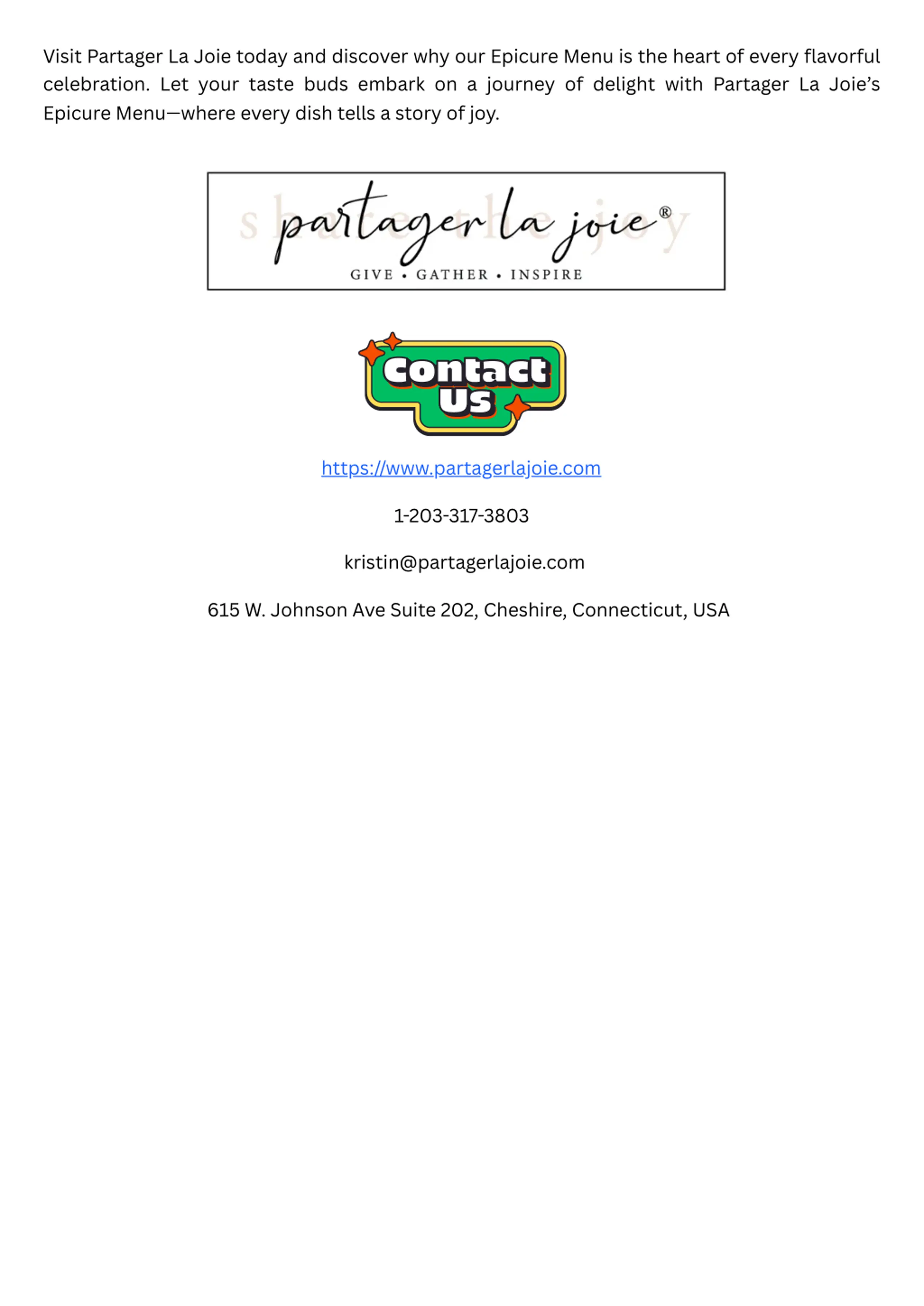Visit Partager La Joie today and discover why our Epicure Menu is the heart of every flavorful celebration. Let your taste buds embark on a journey of delight with Partager La Joie s Epicure Menu where every dish tells a story of joy. https://www.partagerlajoie.com 1-203-317-3803 kristin@partagerlajoie.com 615 W. Johnson Ave Suite 202, Cheshire, Connecticut, USA