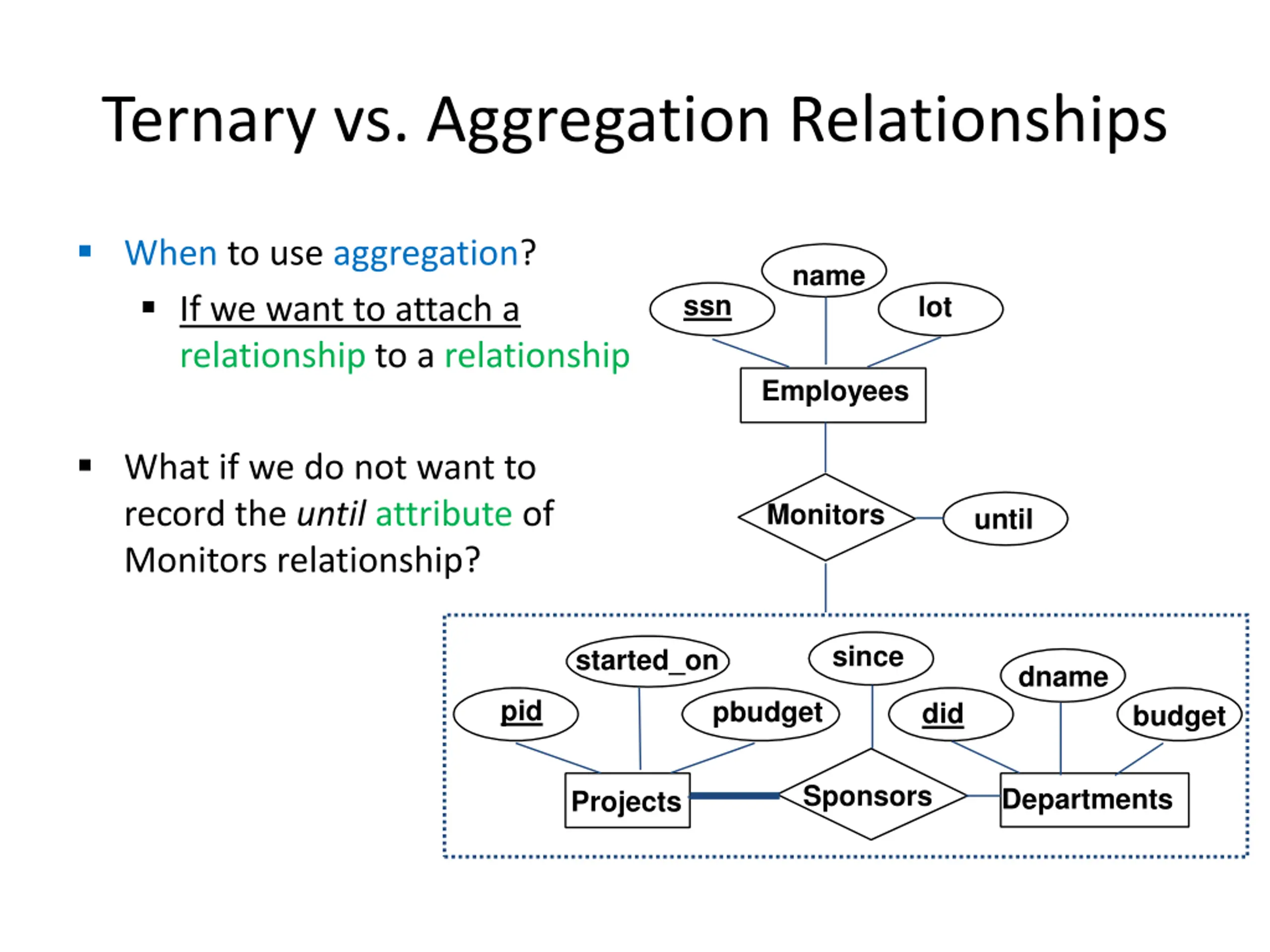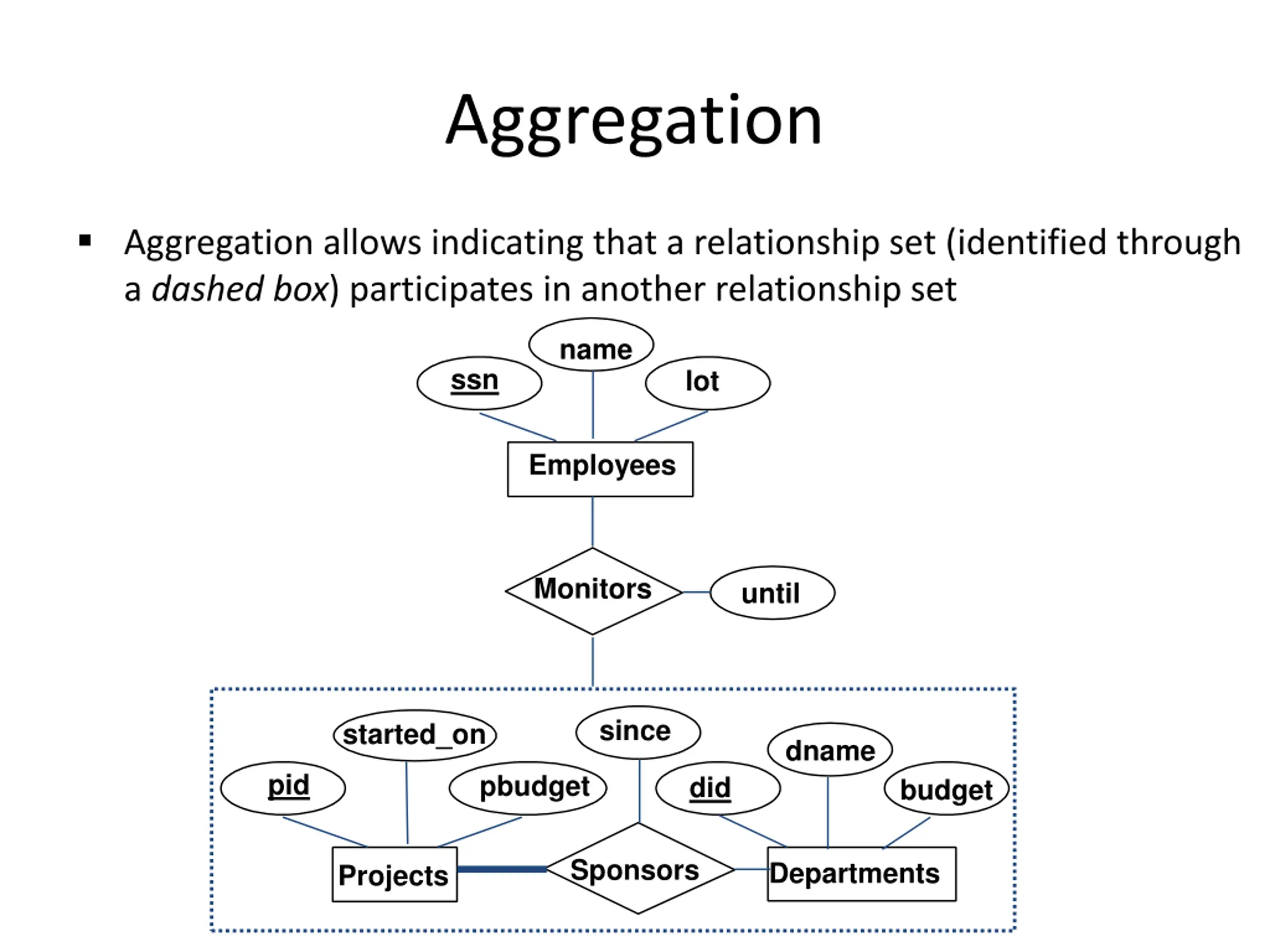 Aggregation Aggregation allows indicating that a relationship set (identified through a dashed box) participates in another relationship set name ssn lot Employees Monitors until since started_on dname pid pbudget did budget Sponsors Departments Projects