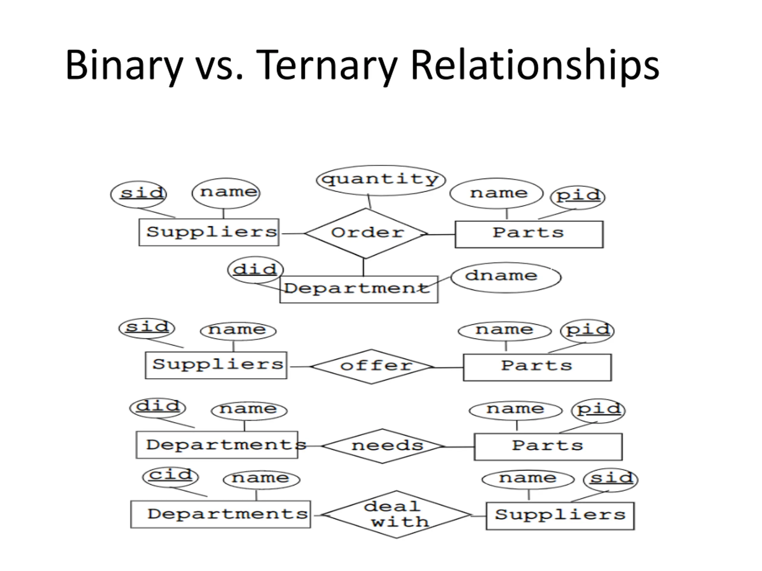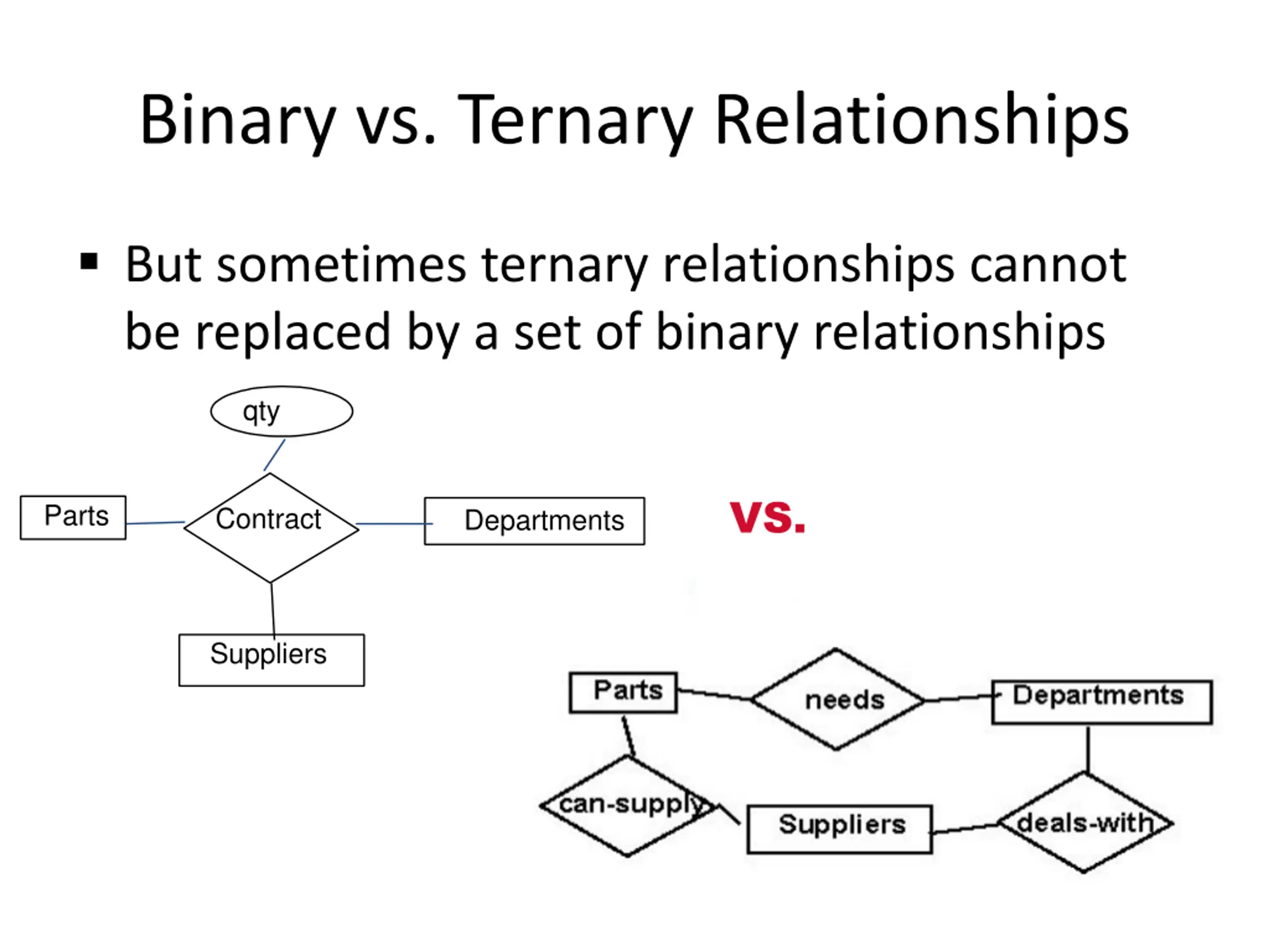 Binary vs. Ternary Relationships But sometimes ternary relationships cannot be replaced by a set of binary relationships qty VS. Parts Contract Departments Suppliers