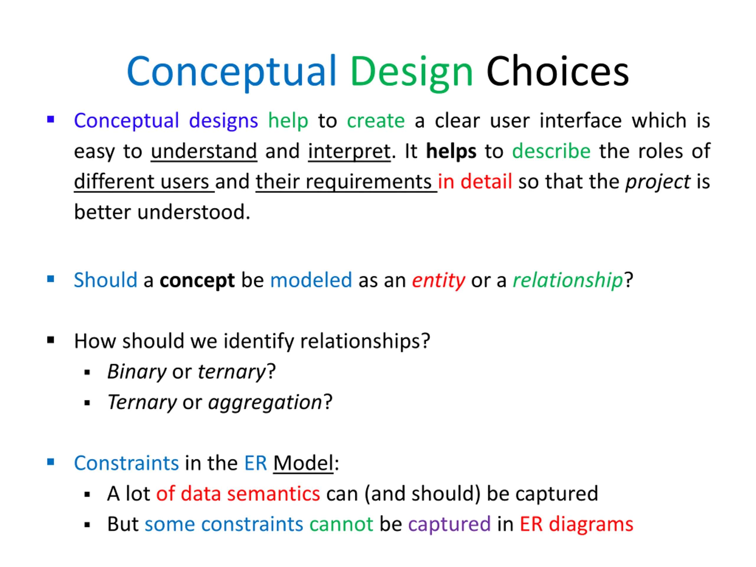 Conceptual Design Choices Conceptual designs help to create a clear user interface which is easy to understand and interpret. It helps to describe the roles of different users and their requirements in detail so that the project is better understood. Should a concept be modeled as an entity or a relationship? How should we identify relationships? Binary or ternary? Ternary or aggregation? Constraints in the ER Model: A lot of data semantics can (and should) be captured But some constraints cannot be captured in ER diagrams