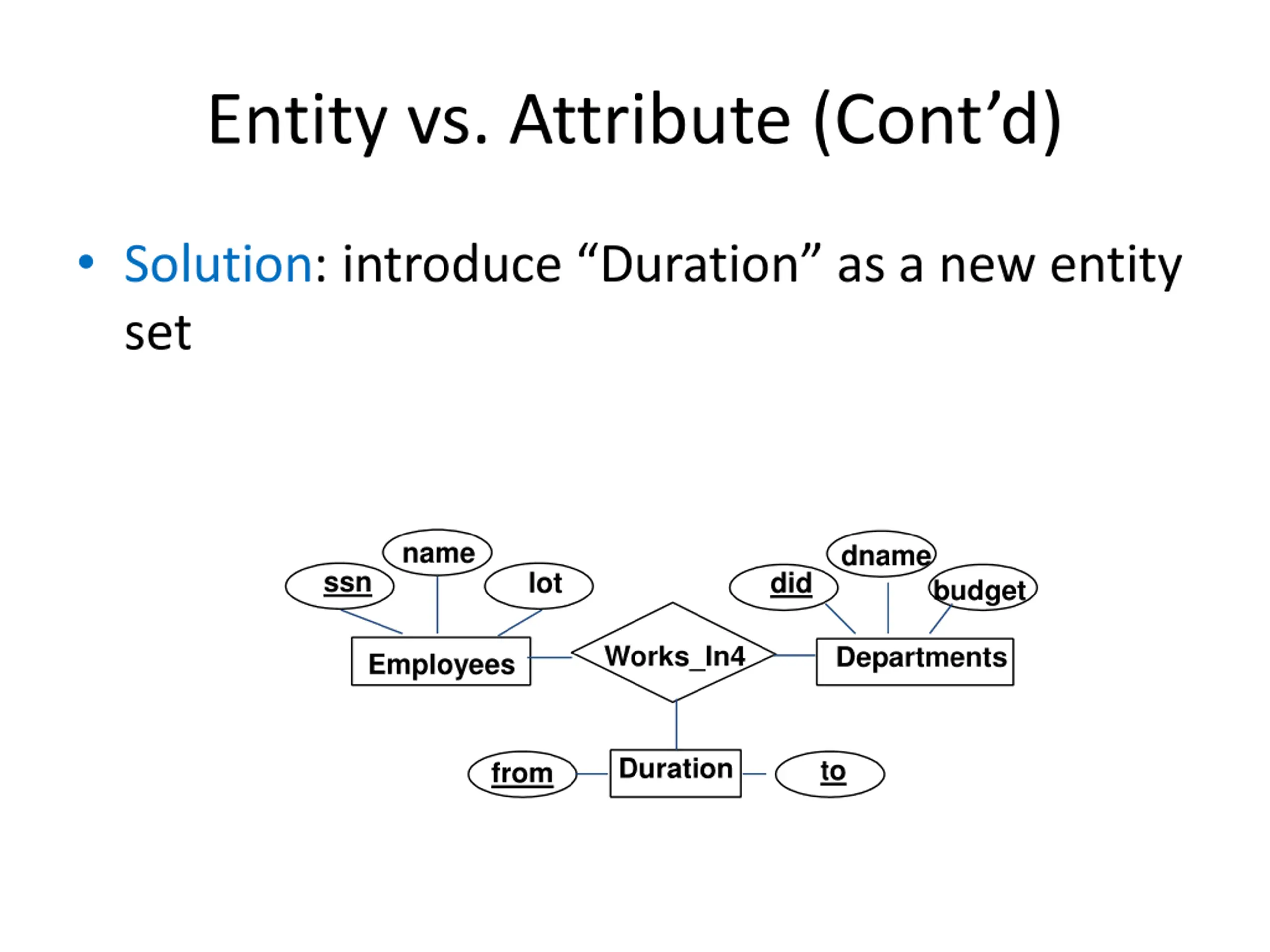 Entity vs. Attribute (Contd) Solution: introduce Duration as a new entity set name dname ssn lot did budget Works_In4 Departments Employees Duration to from
