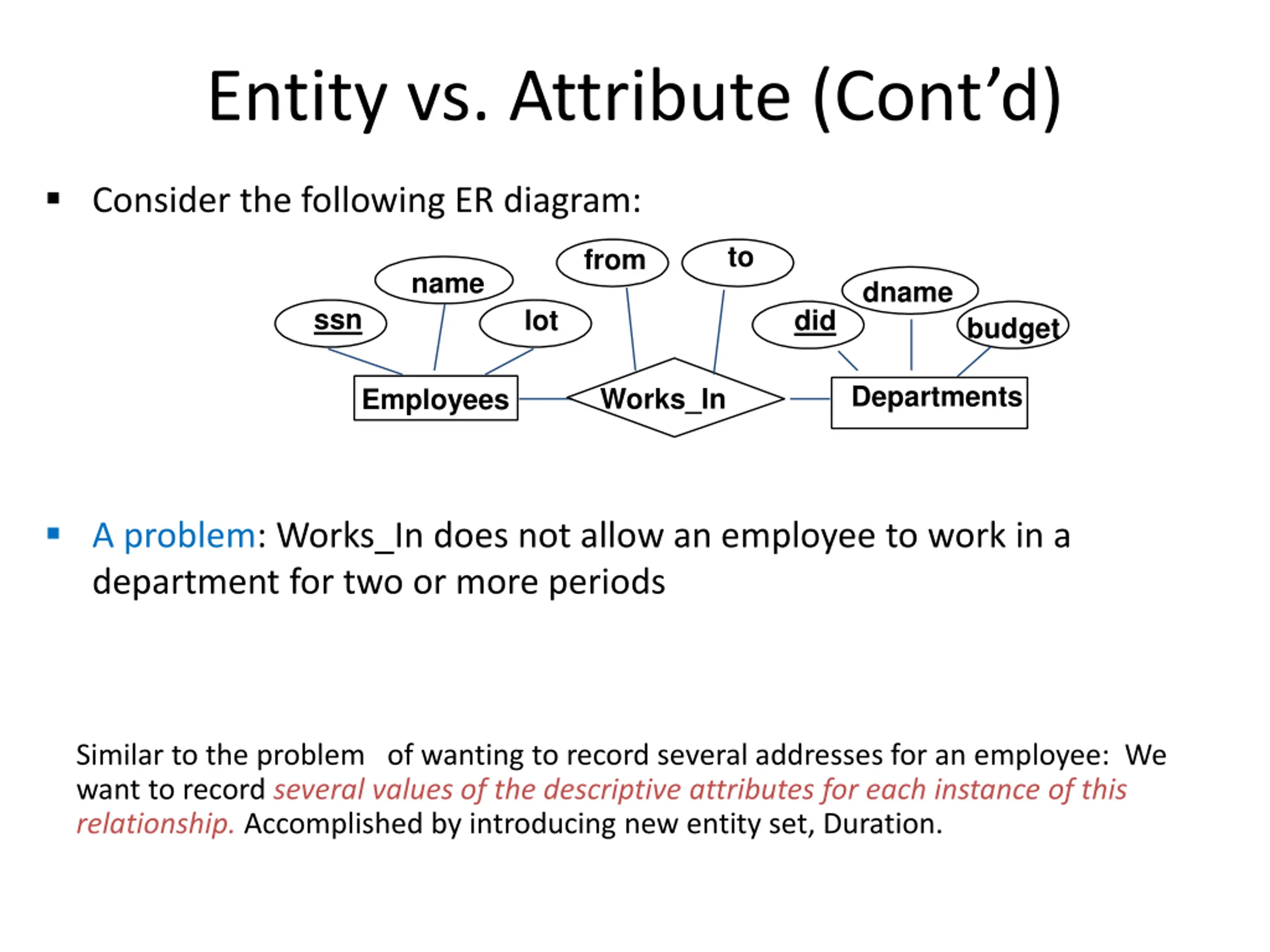 Entity vs. Attribute (Contd) Consider the following ER diagram: to from name dname ssn lot did budget Departments Works_In Employees A problem: Works_In does not allow an employee to work in a department for two or more periods Similar to the problem of wanting to record several addresses for an employee: We want to record several values of the descriptive attributes for each instance of this relationship. Accomplished by introducing new entity set, Duration.