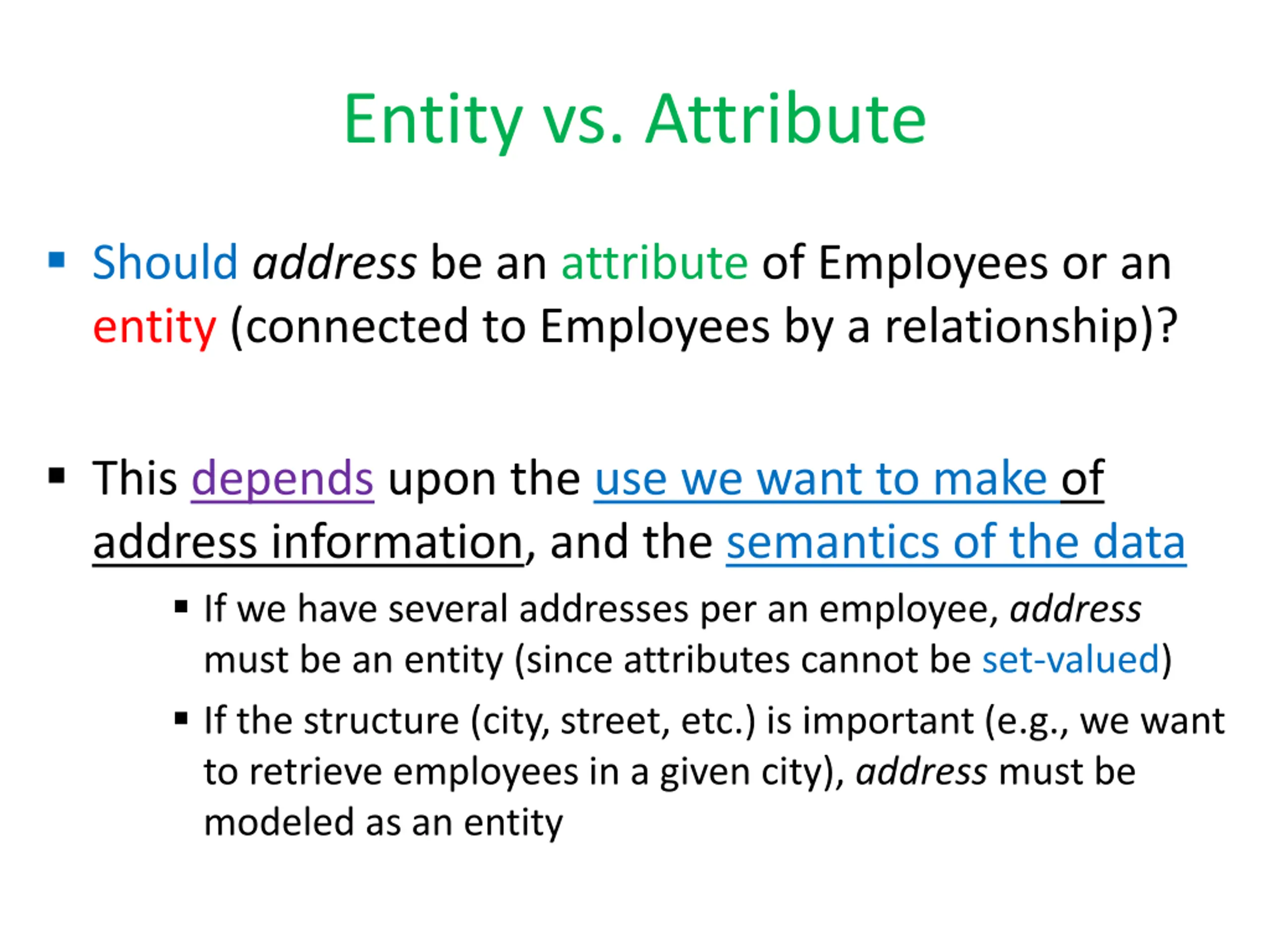 Entity vs. Attribute Should address be an attribute of Employees or an entity (connected to Employees by a relationship)? This depends upon the use we want to make of address information, and the semantics of the data If we have several addresses per an employee, address must be an entity (since attributes cannot be set-valued) If the structure (city, street, etc.) is important (e.g., we want to retrieve employees in a given city), address must be modeled as an entity