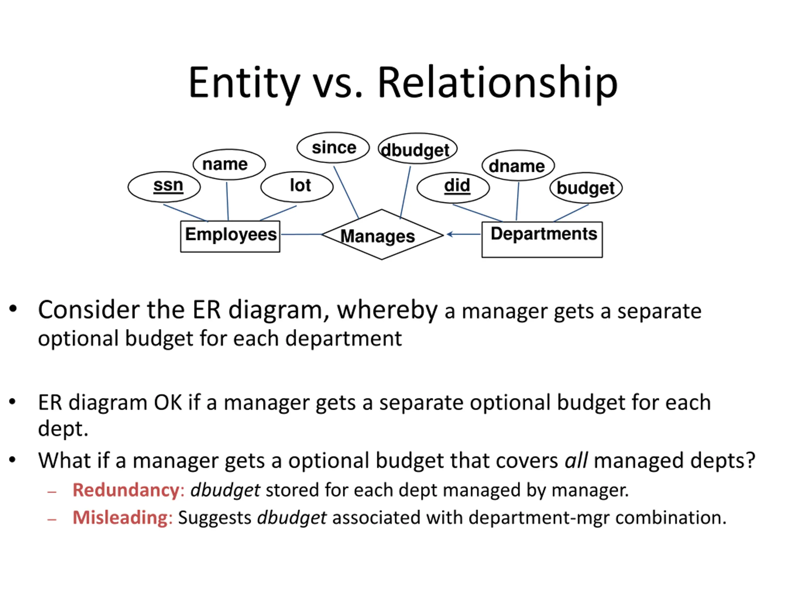 Entity vs. Relationship since dbudget name dname ssn lot did budget Departments Employees Manages Consider the ER diagram, whereby a manager gets a separate optional budget for each department ER diagram OK if a manager gets a separate optional budget for each dept. What if a manager gets a optional budget that covers all managed depts? Redundancy: dbudget stored for each dept managed by manager. Misleading: Suggests dbudget associated with department-mgr combination.
