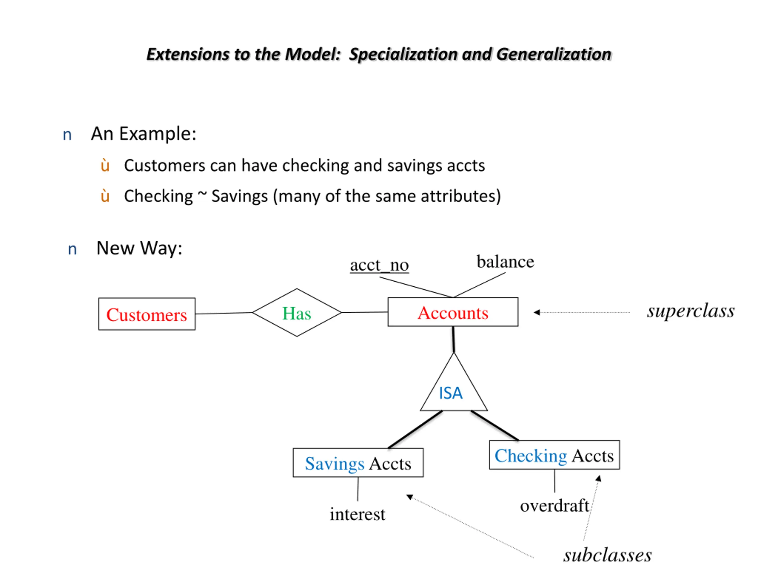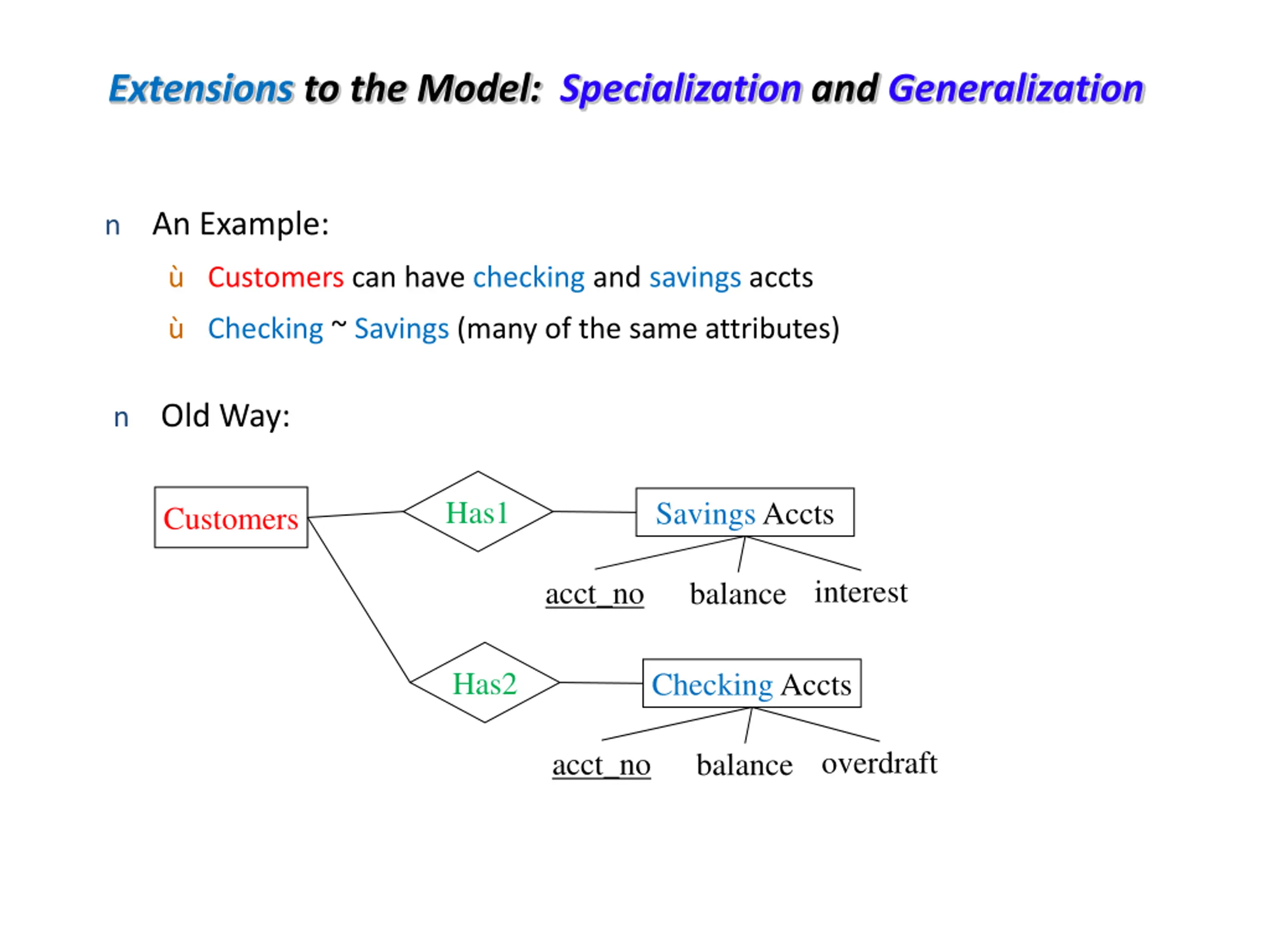 Extensions to the Model: Specialization and Generalization n An Example: Customers can have checking and savings accts Checking ~ Savings (many of the same attributes) n Old Way: Has1 Savings Accts Customers balance interest acct_no Has2 Checking Accts balance overdraft acct_no