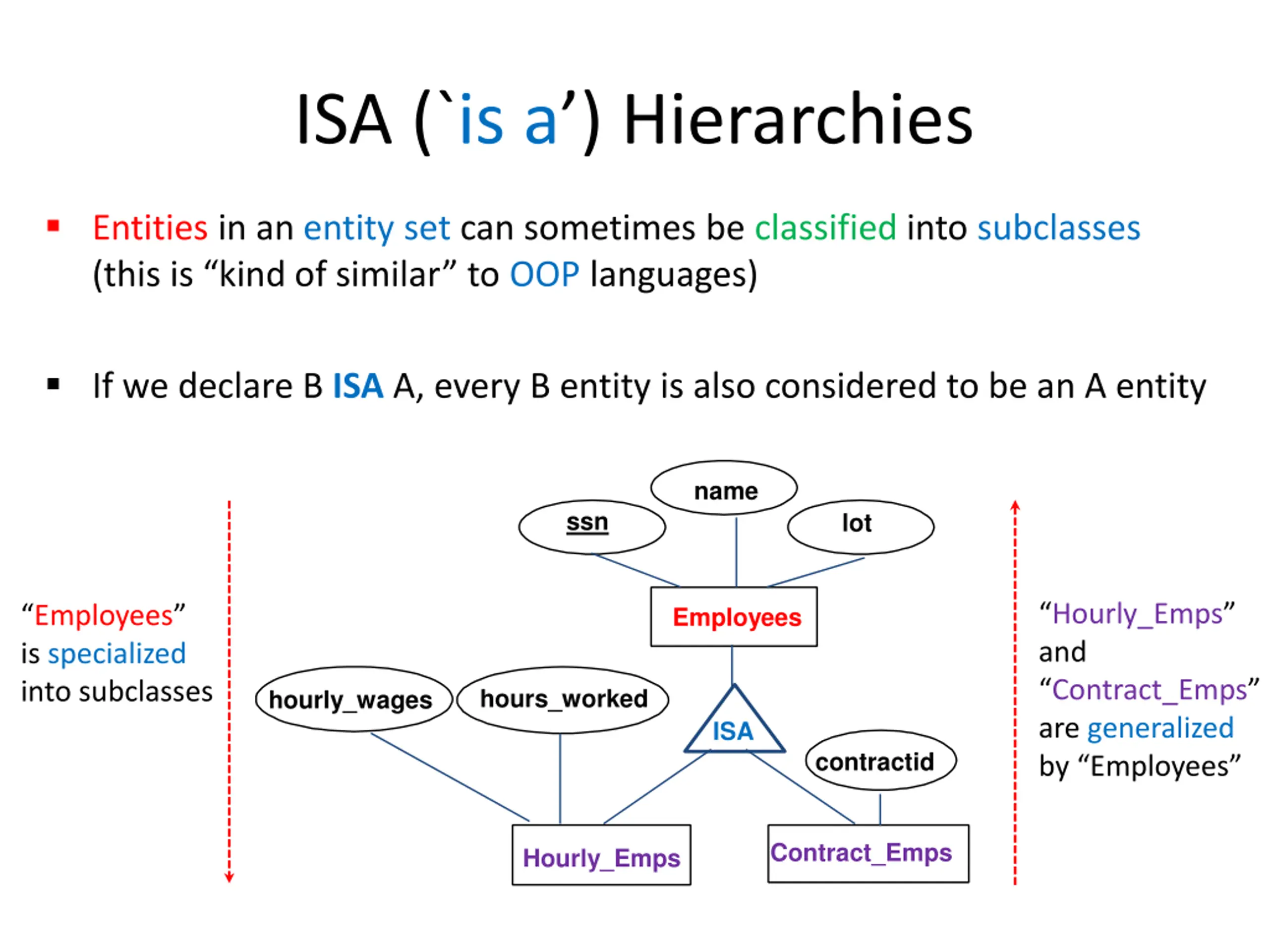ISA (`is a) Hierarchies Entities in an entity set can sometimes be classified into subclasses (this is kind of similar to OOP languages) If we declare B ISA A, every B entity is also considered to be an A entity name ssn lot Hourly_Emps and Contract_Emps are generalized by Employees Employees is specialized into subclasses Employees hours_worked hourly_wages ISA contractid Contract_Emps Hourly_Emps