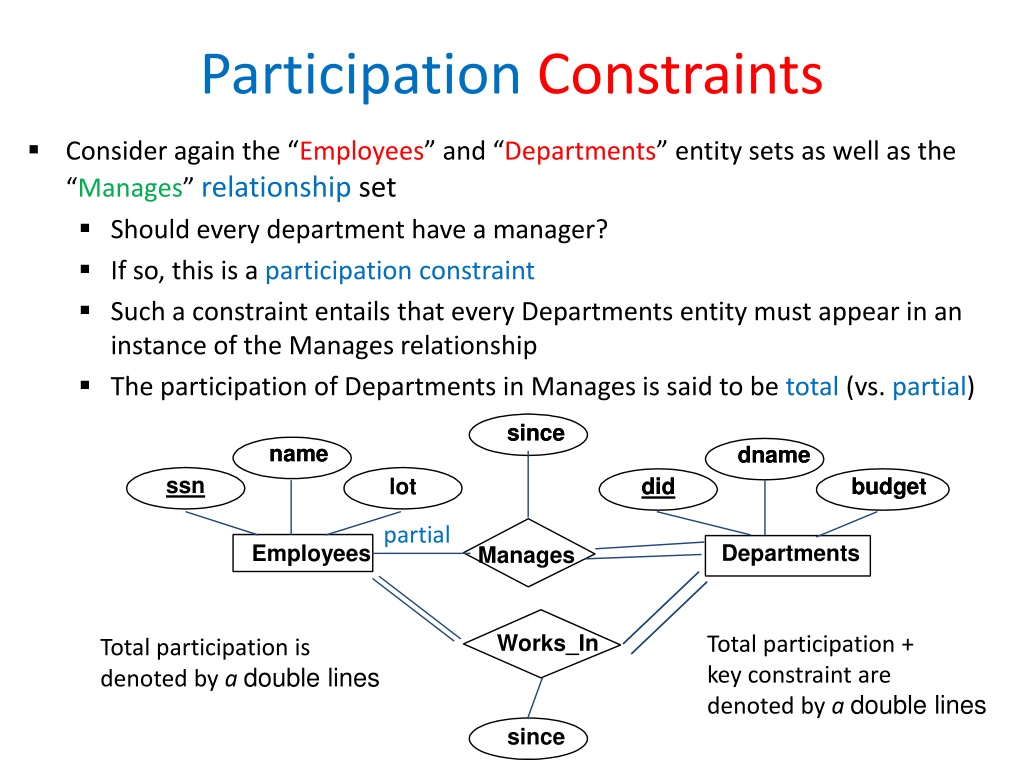Total vs. Partial Participations Participation Constraints Total Participation Each entity is involved in the relationship. Total participation is represented by double lines. Partial participation Not all entities are involved in the relationship. Partial participation is represented by single lines.