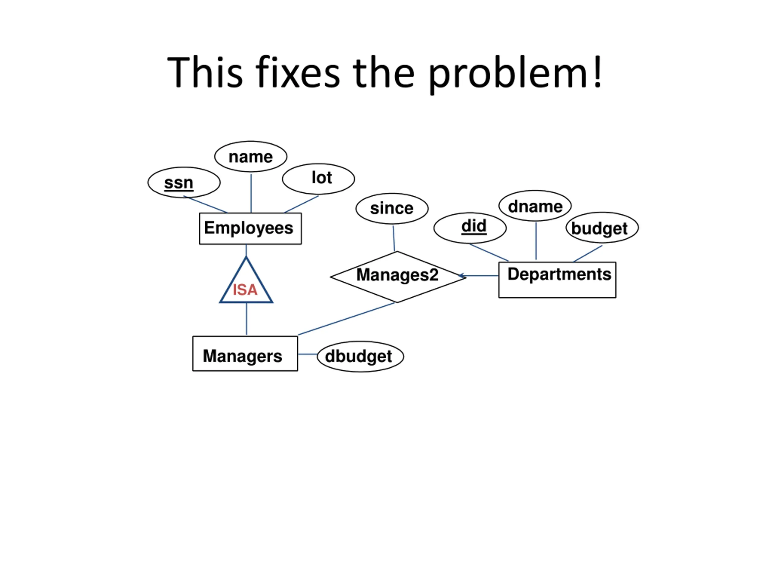 This fixes the problem! name lot ssn dname since did Employees budget Departments Manages2 ISA Managers dbudget