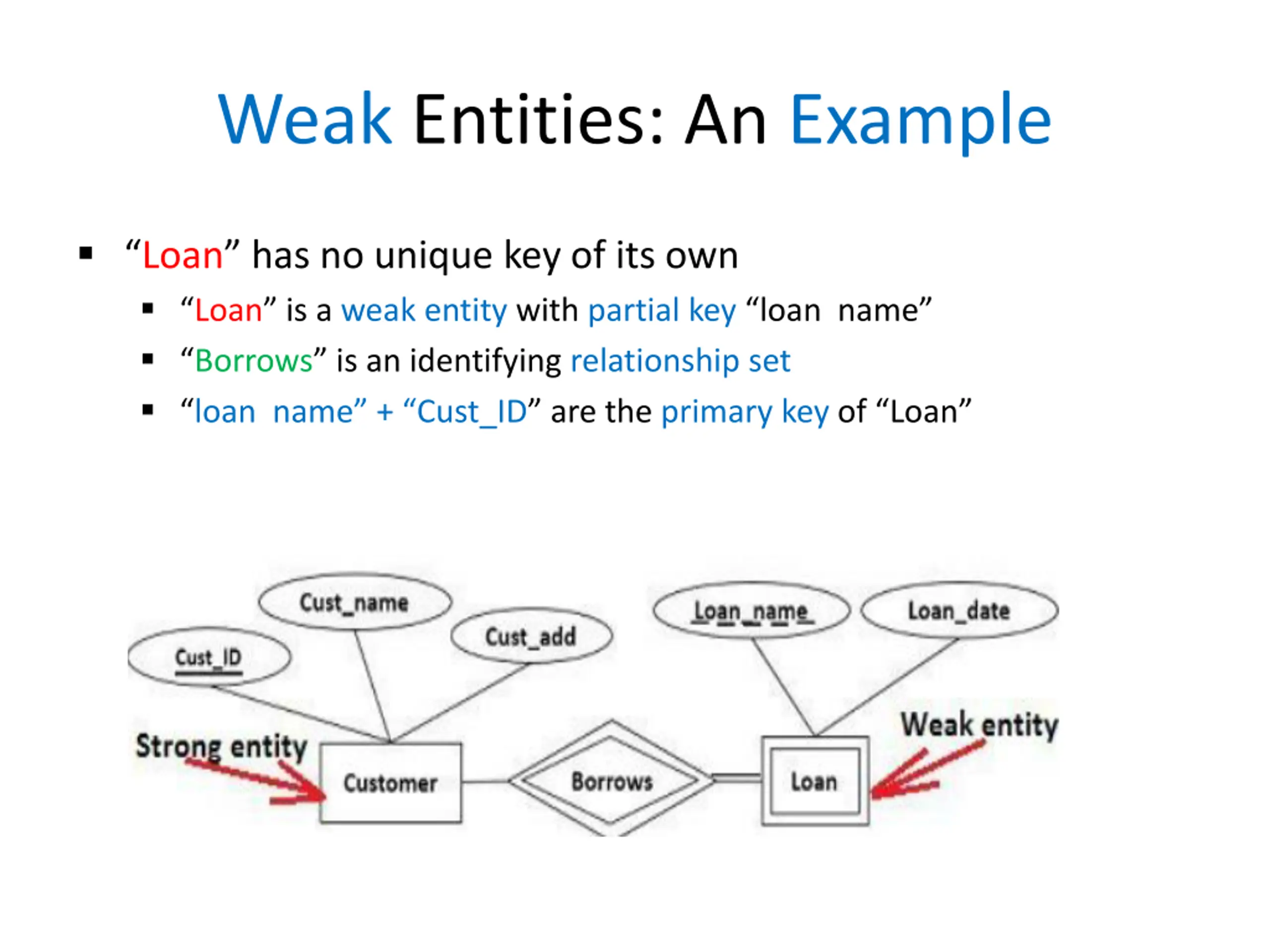 Weak Entities: An Example Loan has no unique key of its own Loan is a weak entity with partial key loan name Borrows is an identifying relationship set loan name + Cust_ID are the primary key of Loan