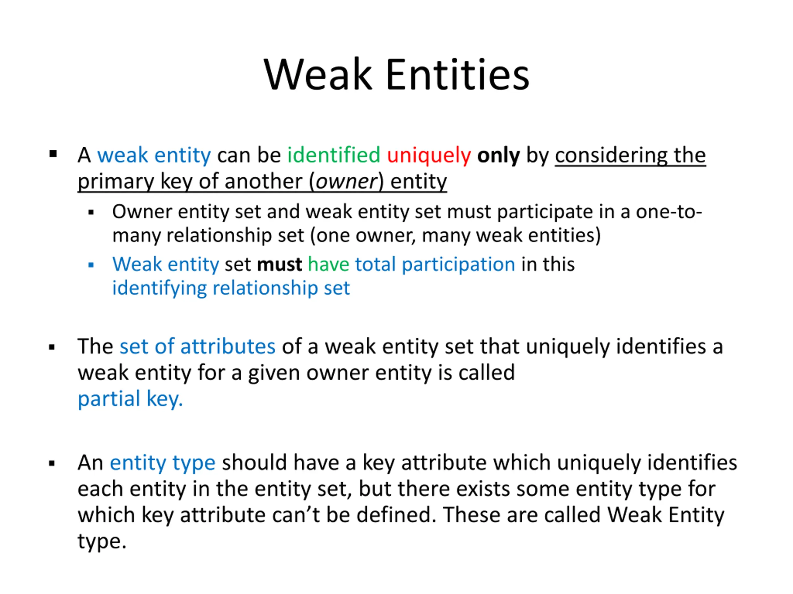 Weak Entities A weak entity can be identified uniquely only by considering the primary key of another (owner) entity Owner entity set and weak entity set must participate in a one-to- many relationship set (one owner, many weak entities) Weak entity set must have total participation in this identifying relationship set The set of attributes of a weak entity set that uniquely identifies a weak entity for a given owner entity is called partial key. An entity type should have a key attribute which uniquely identifies each entity in the entity set, but there exists some entity type for which key attribute can t be defined. These are called Weak Entity type.