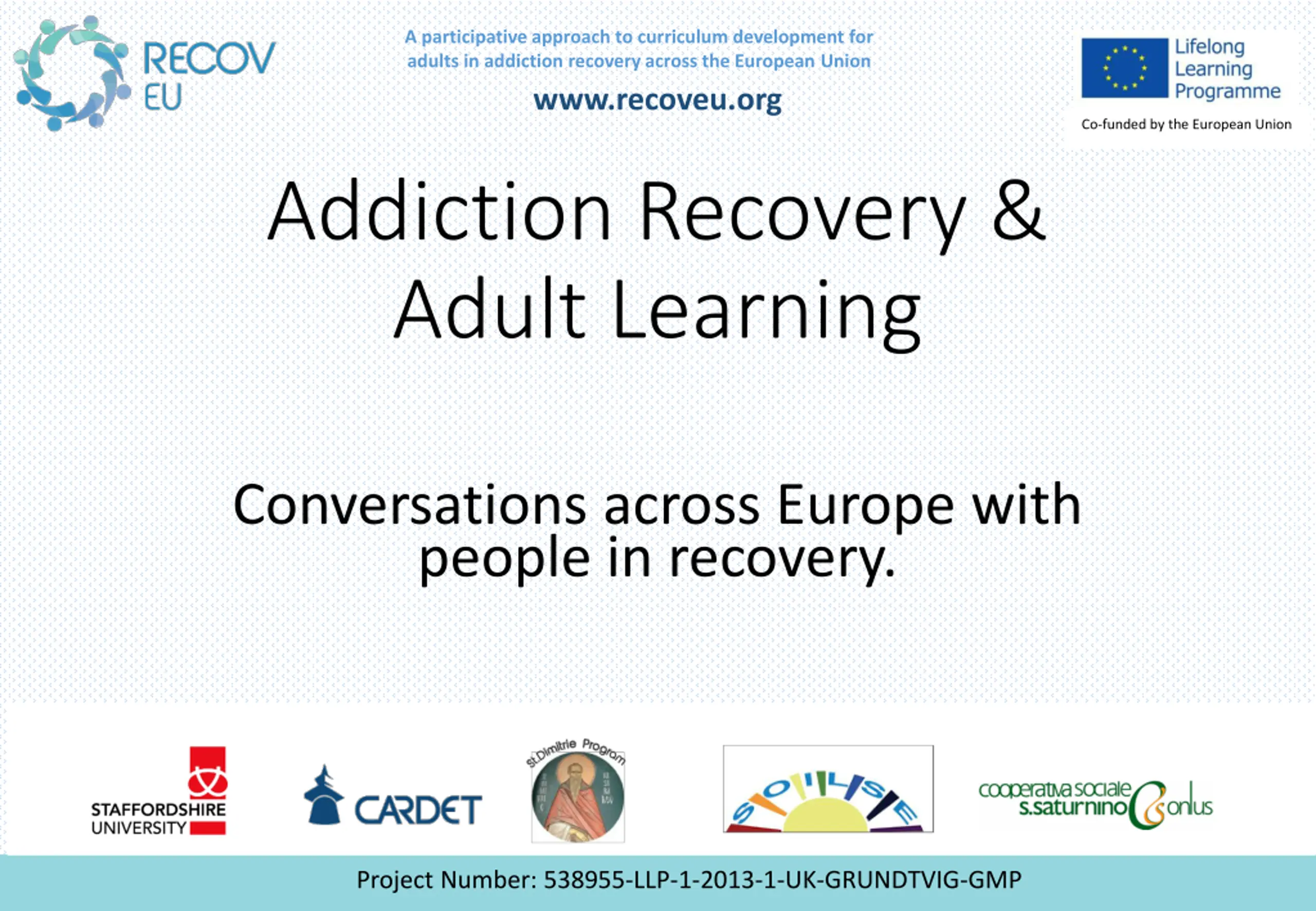 A participative approach to curriculum development for adults in addiction recovery across the European Union www.recoveu.org Co-funded by the European Union Addiction Recovery & Adult Learning Conversations across Europe with people in recovery. Project Number: 538955-LLP-1-2013-1-UK-GRUNDTVIG-GMP