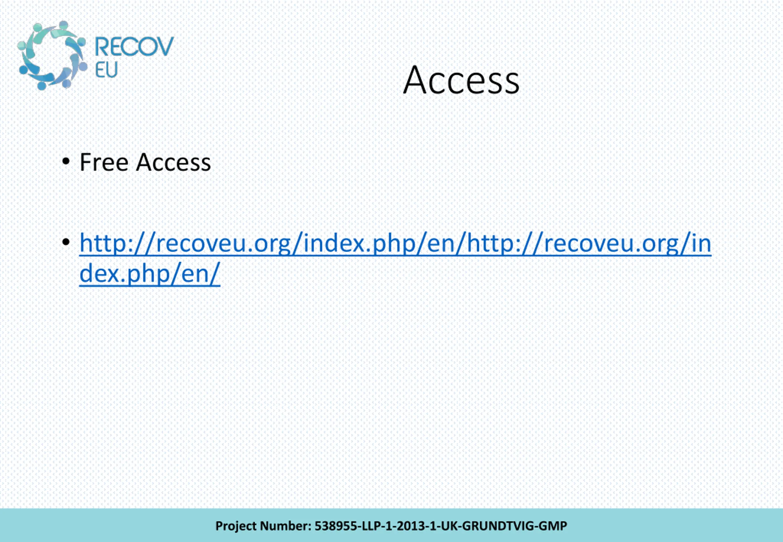 Access Free Access http://recoveu.org/index.php/en/http://recoveu.org/in dex.php/en/ Project Number: 538955-LLP-1-2013-1-UK-GRUNDTVIG-GMP