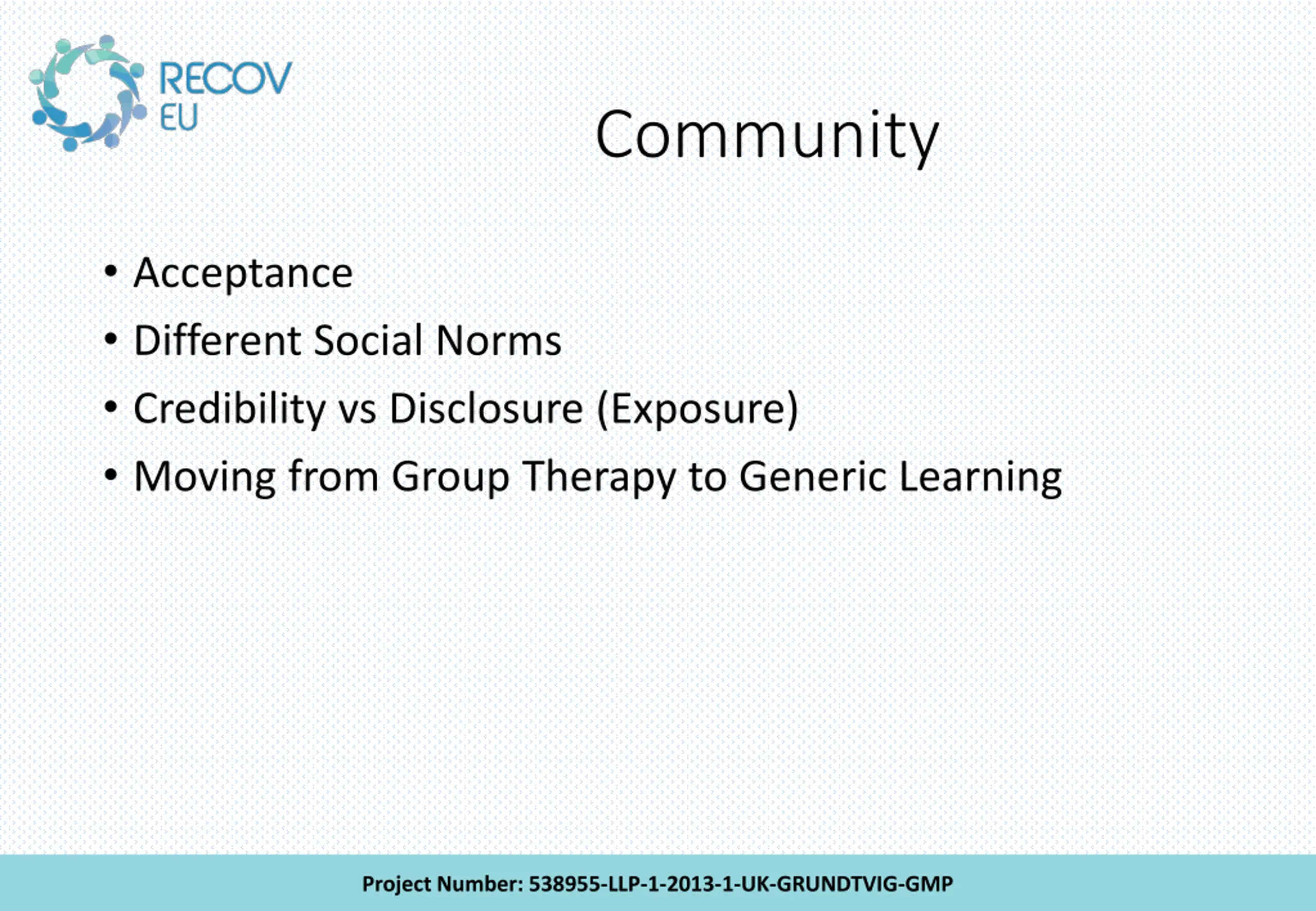 Community Acceptance Different Social Norms Credibility vs Disclosure (Exposure) Moving from Group Therapy to Generic Learning Project Number: 538955-LLP-1-2013-1-UK-GRUNDTVIG-GMP