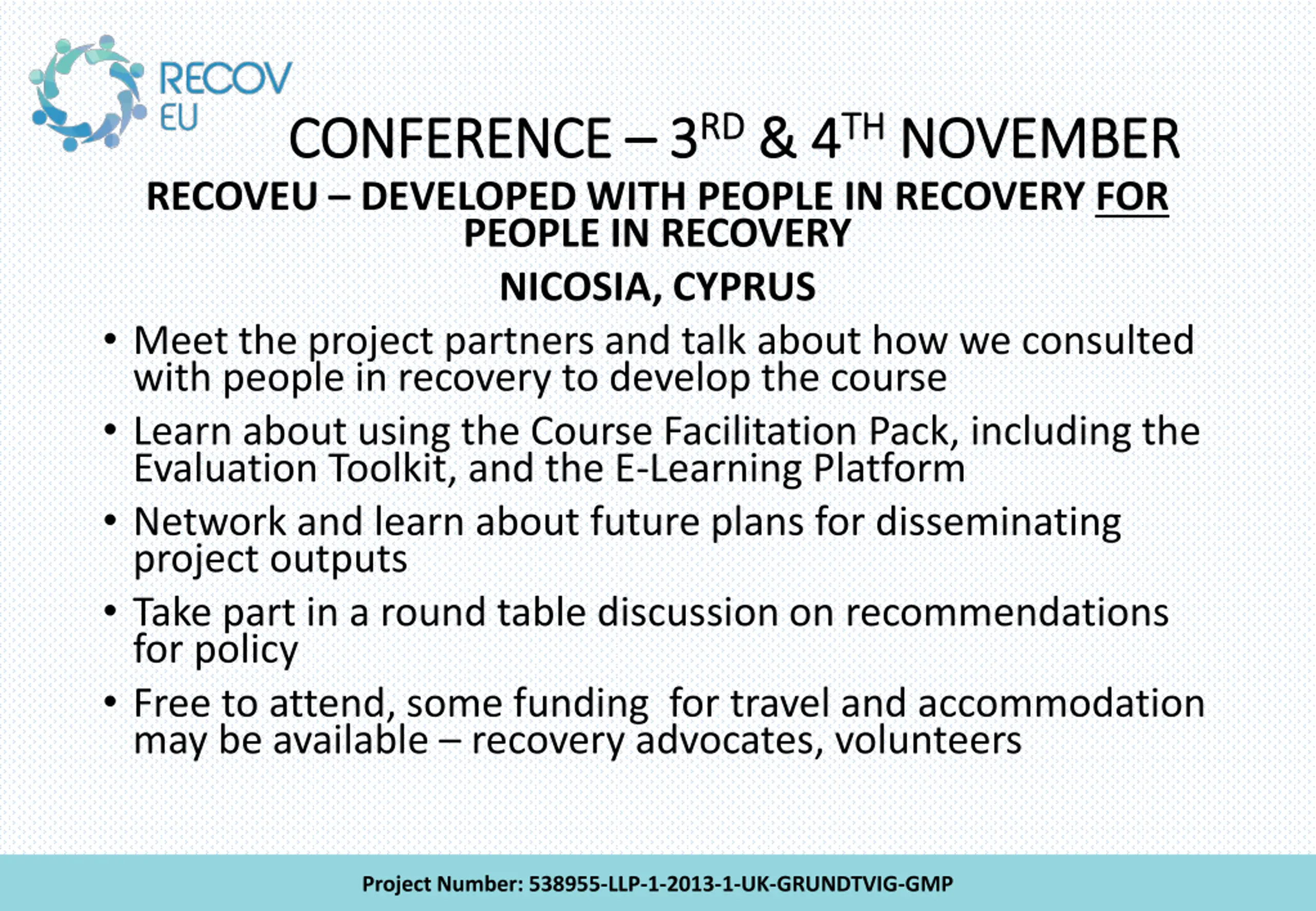 CONFERENCE CONFERENCE 3 3RD RECOVEU DEVELOPED WITH PEOPLE IN RECOVERY FOR PEOPLE IN RECOVERY NICOSIA, CYPRUS Meet the project partners and talk about how we consulted with people in recovery to develop the course Learn about using the Course Facilitation Pack, including the Evaluation Toolkit, and the E-Learning Platform Network and learn about future plans for disseminating project outputs Take part in a round table discussion on recommendations for policy Free to attend, some funding for travel and accommodation may be available recovery advocates, volunteers RD & 4 & 4TH TH NOVEMBER NOVEMBER Project Number: 538955-LLP-1-2013-1-UK-GRUNDTVIG-GMP