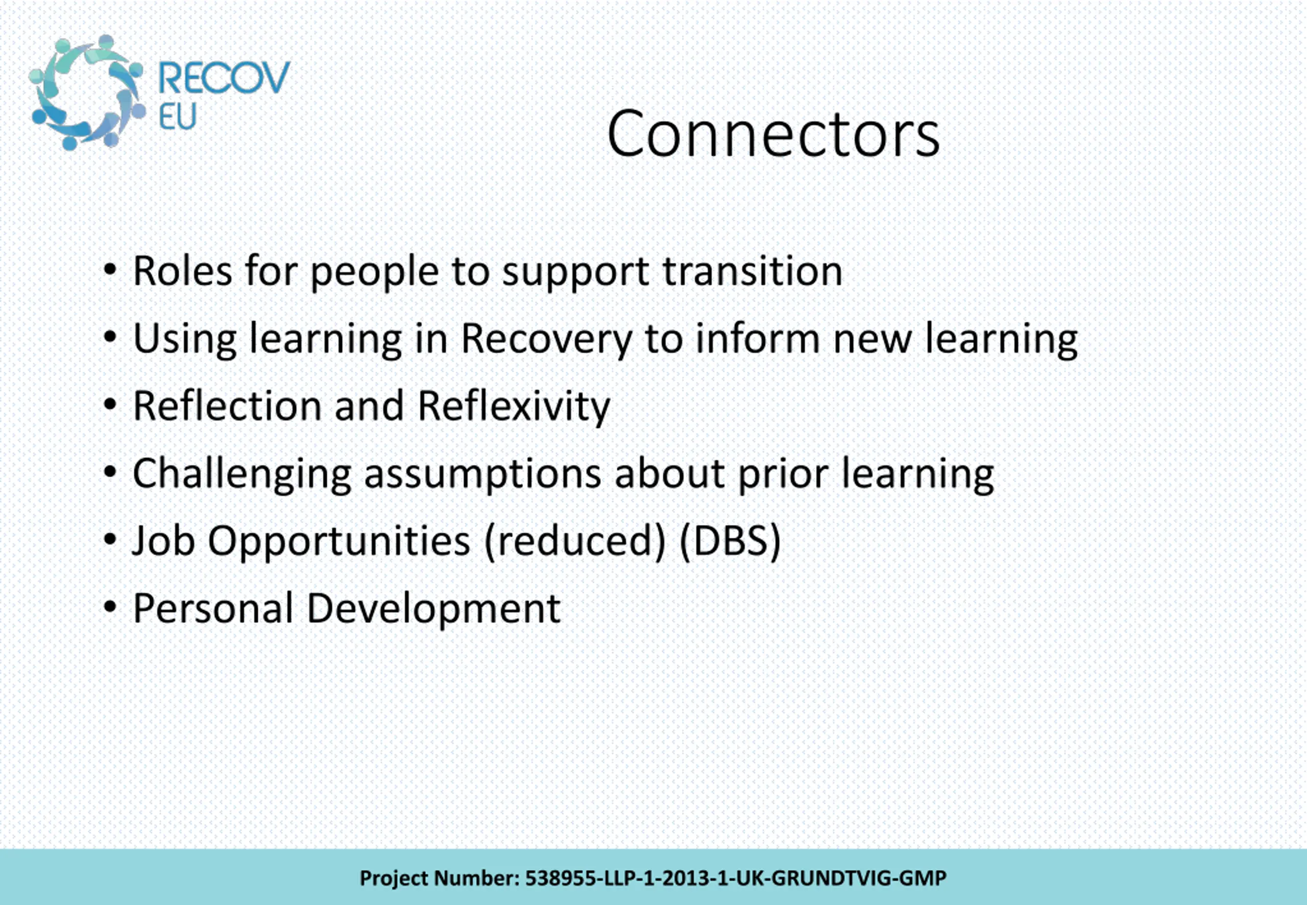 Connectors Roles for people to support transition Using learning in Recovery to inform new learning Reflection and Reflexivity Challenging assumptions about prior learning Job Opportunities (reduced) (DBS) Personal Development Project Number: 538955-LLP-1-2013-1-UK-GRUNDTVIG-GMP