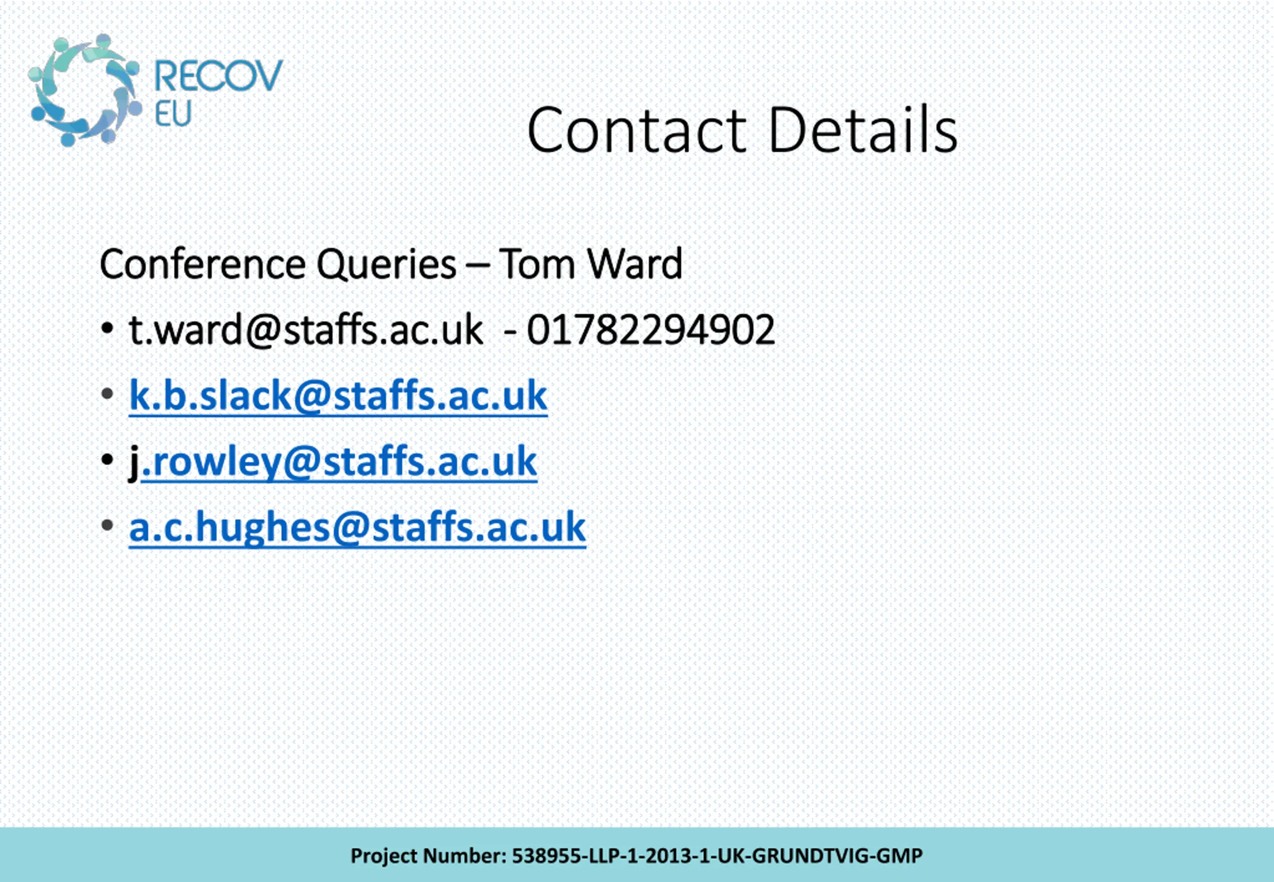 Contact Details Conference Conference Queries t.ward@staffs.ac.uk t.ward@staffs.ac.uk - - 01782294902 k.b.slack@staffs.ac.uk j.rowley@staffs.ac.uk a.c.hughes@staffs.ac.uk Queries Tom Ward Tom Ward 01782294902 Project Number: 538955-LLP-1-2013-1-UK-GRUNDTVIG-GMP