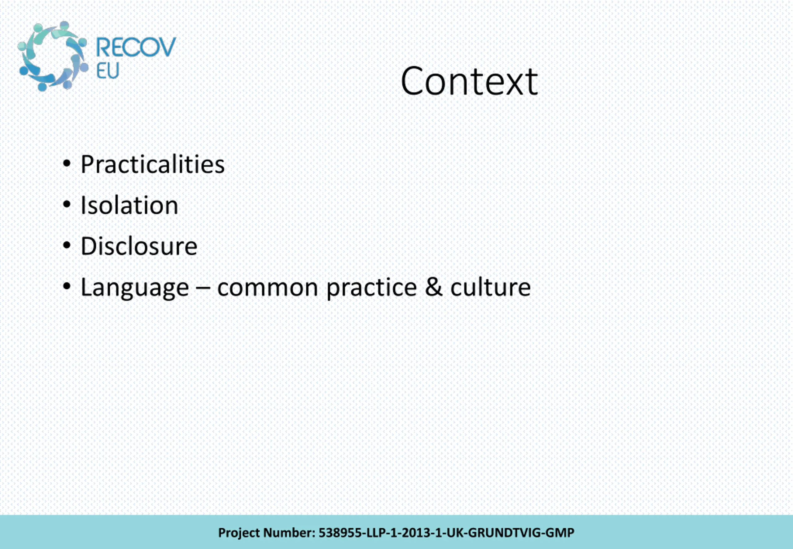 Context Practicalities Isolation Disclosure Language common practice & culture Project Number: 538955-LLP-1-2013-1-UK-GRUNDTVIG-GMP