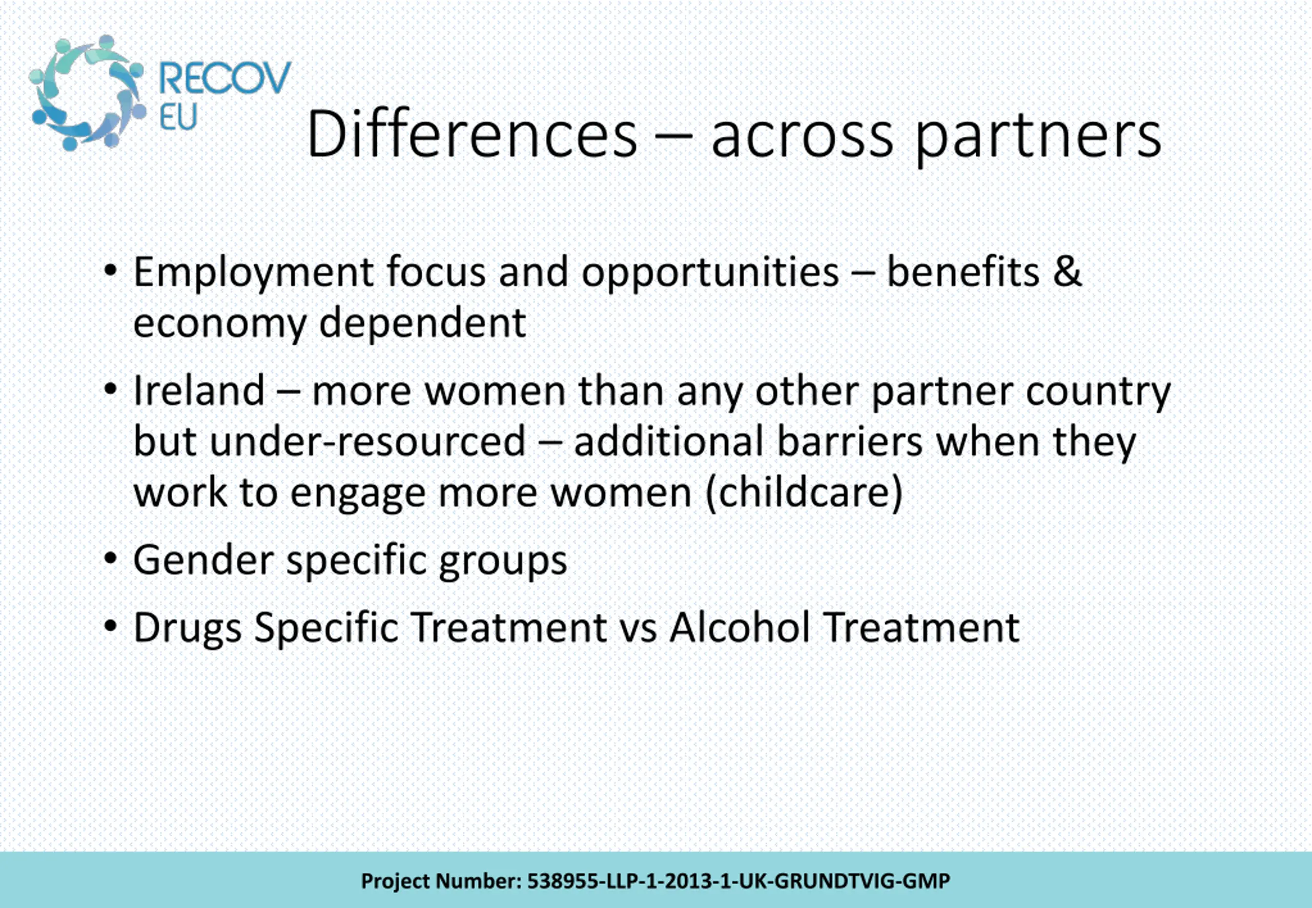 Differences across partners Employment focus and opportunities benefits & economy dependent Ireland more women than any other partner country but under-resourced additional barriers when they work to engage more women (childcare) Gender specific groups Drugs Specific Treatment vs Alcohol Treatment Project Number: 538955-LLP-1-2013-1-UK-GRUNDTVIG-GMP