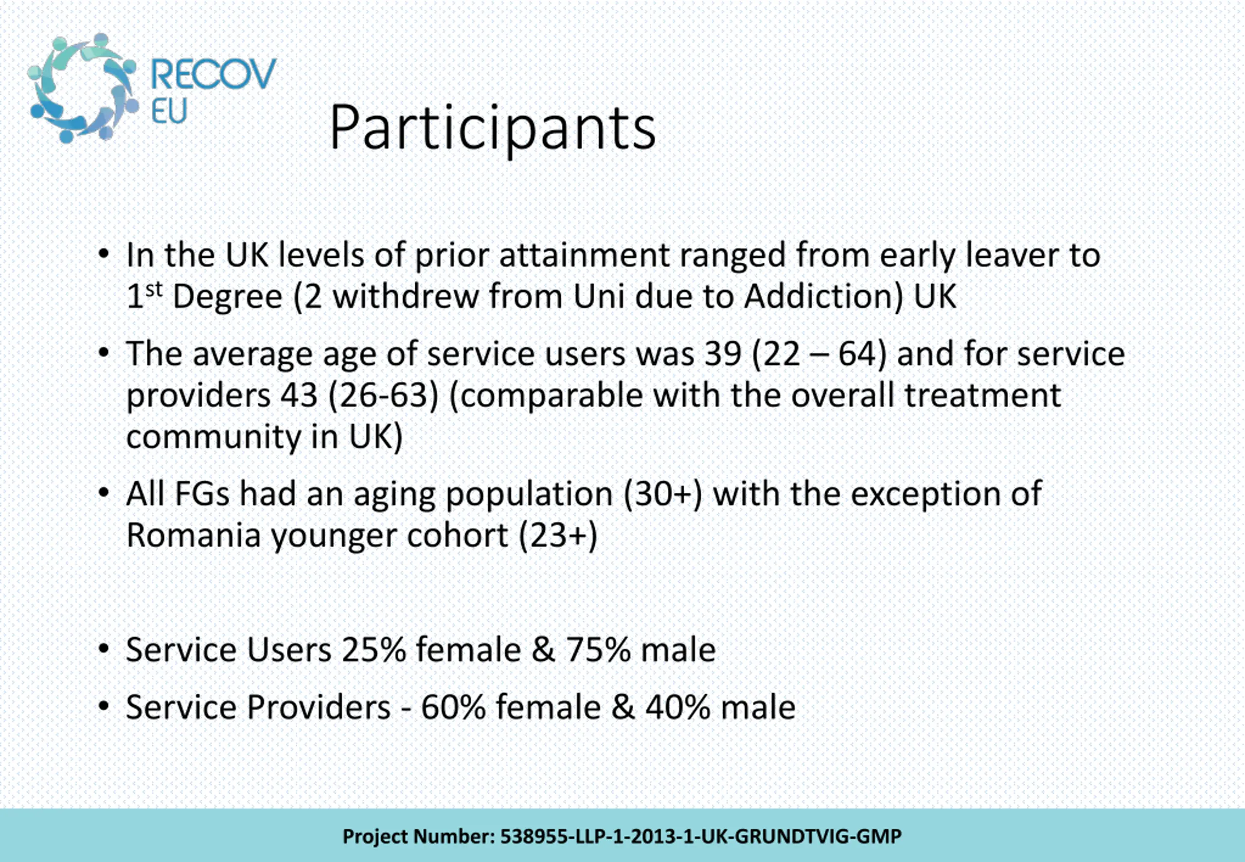 Participants In the UK levels of prior attainment ranged from early leaver to 1st Degree (2 withdrew from Uni due to Addiction) UK The average age of service users was 39 (22 64) and for service providers 43 (26-63) (comparable with the overall treatment community in UK) All FGs had an aging population (30+) with the exception of Romania younger cohort (23+) Service Users 25% female & 75% male Service Providers - 60% female & 40% male Project Number: 538955-LLP-1-2013-1-UK-GRUNDTVIG-GMP
