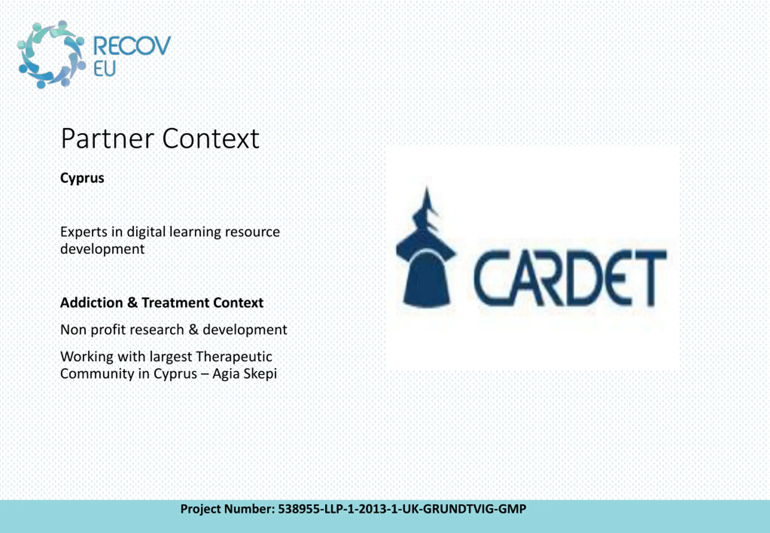 Partner Context Cyprus Experts in digital learning resource development Addiction & Treatment Context Non profit research & development Working with largest Therapeutic Community in Cyprus Agia Skepi Project Number: 538955-LLP-1-2013-1-UK-GRUNDTVIG-GMP