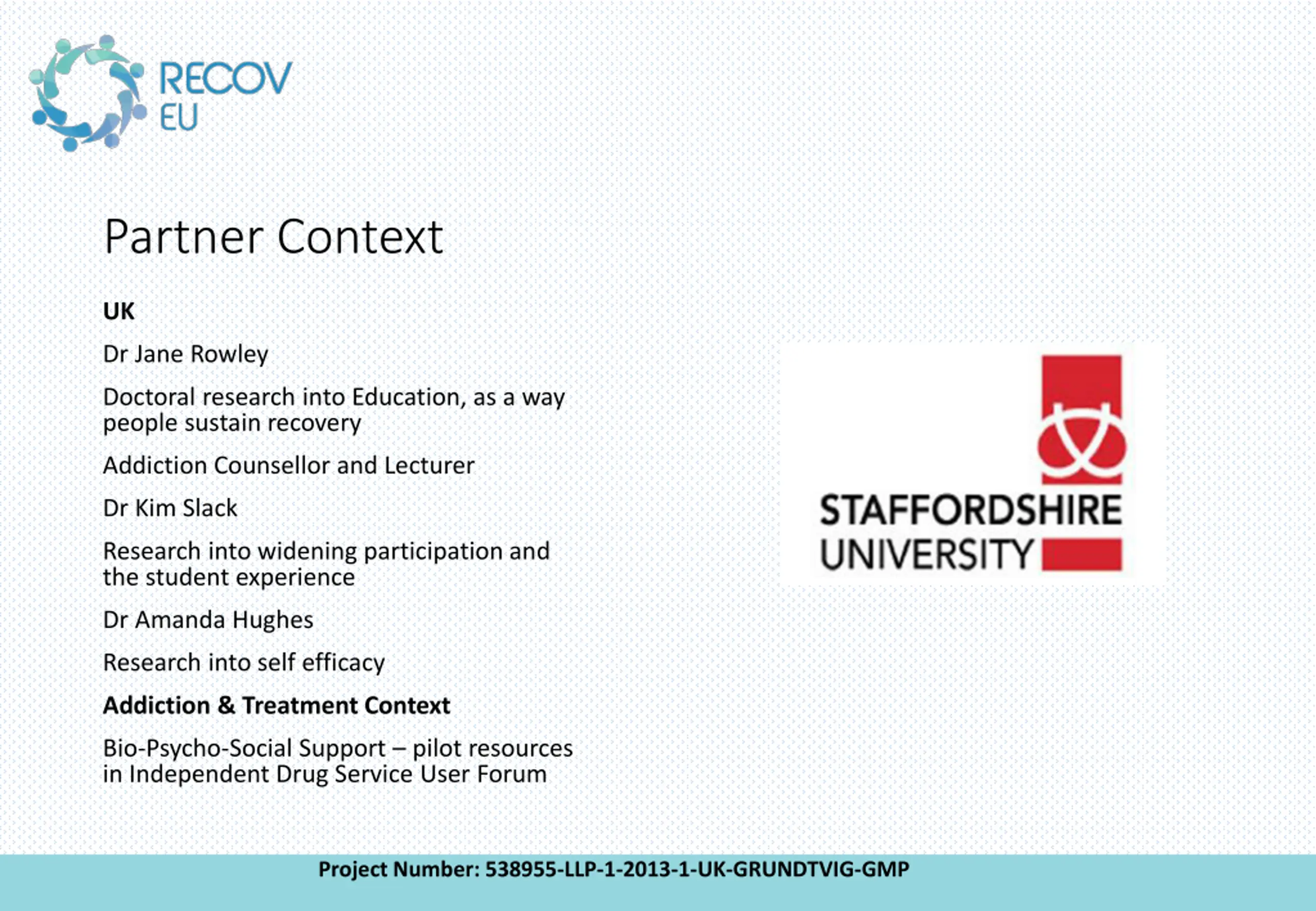 Partner Context UK Dr Jane Rowley Doctoral research into Education, as a way people sustain recovery Addiction Counsellor and Lecturer Dr Kim Slack Research into widening participation and the student experience Dr Amanda Hughes Research into self efficacy Addiction & Treatment Context Bio-Psycho-Social Support pilot resources in Independent Drug Service User Forum Project Number: 538955-LLP-1-2013-1-UK-GRUNDTVIG-GMP